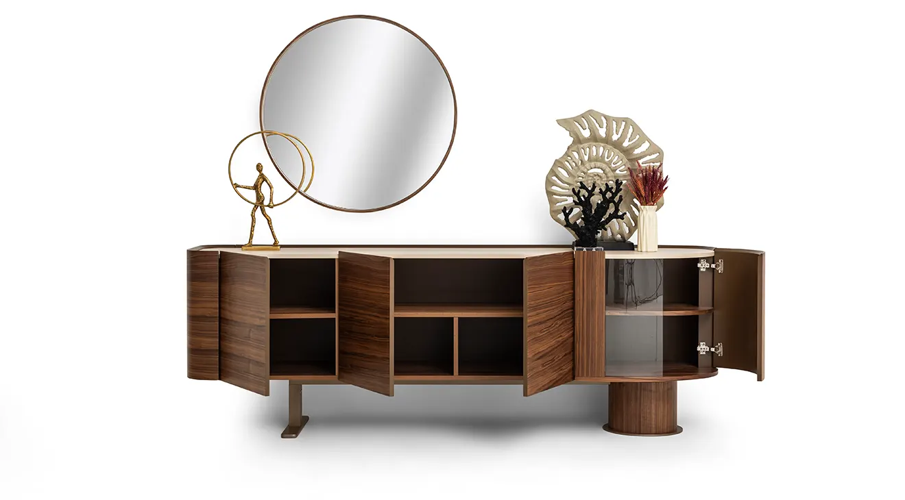 Konsol içindeki bölmelendirme sistemleri, yemek takımlarınızdan gümüşlüklerinize kadar her şeyi düzenli tutmanızı sağlar. Bu yıl özellikle konsol kapaklarında kullanılan hazeran detaylar veya dikey çizgili lambri işlemeler, mobilyaya üç boyutlu bir derinlik katıyor. Tasarımlarımızda kullandığımız temperli camlar ve bronz aynalar ise modernizmi estetikle birleştiriyor.