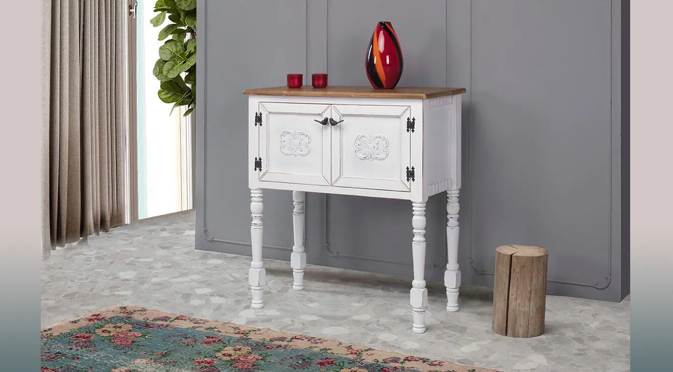 Ada Dressuar, masif görünümlü ahşap üst tabla, oyma kapak detayları ve kuş formunda zarif kollarıyla girişe karakter katar. İki kapaklı depolama alanı günlük eşyaları düzenler; farklı renk seçenekleriyle klasik-modern dekorlara uyum sağlar.