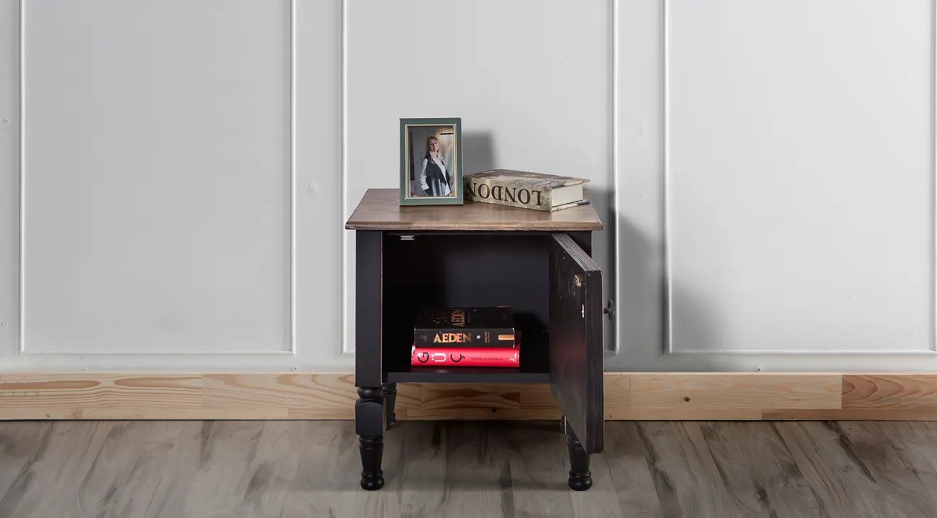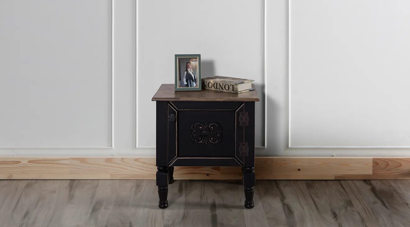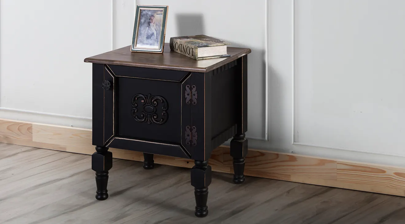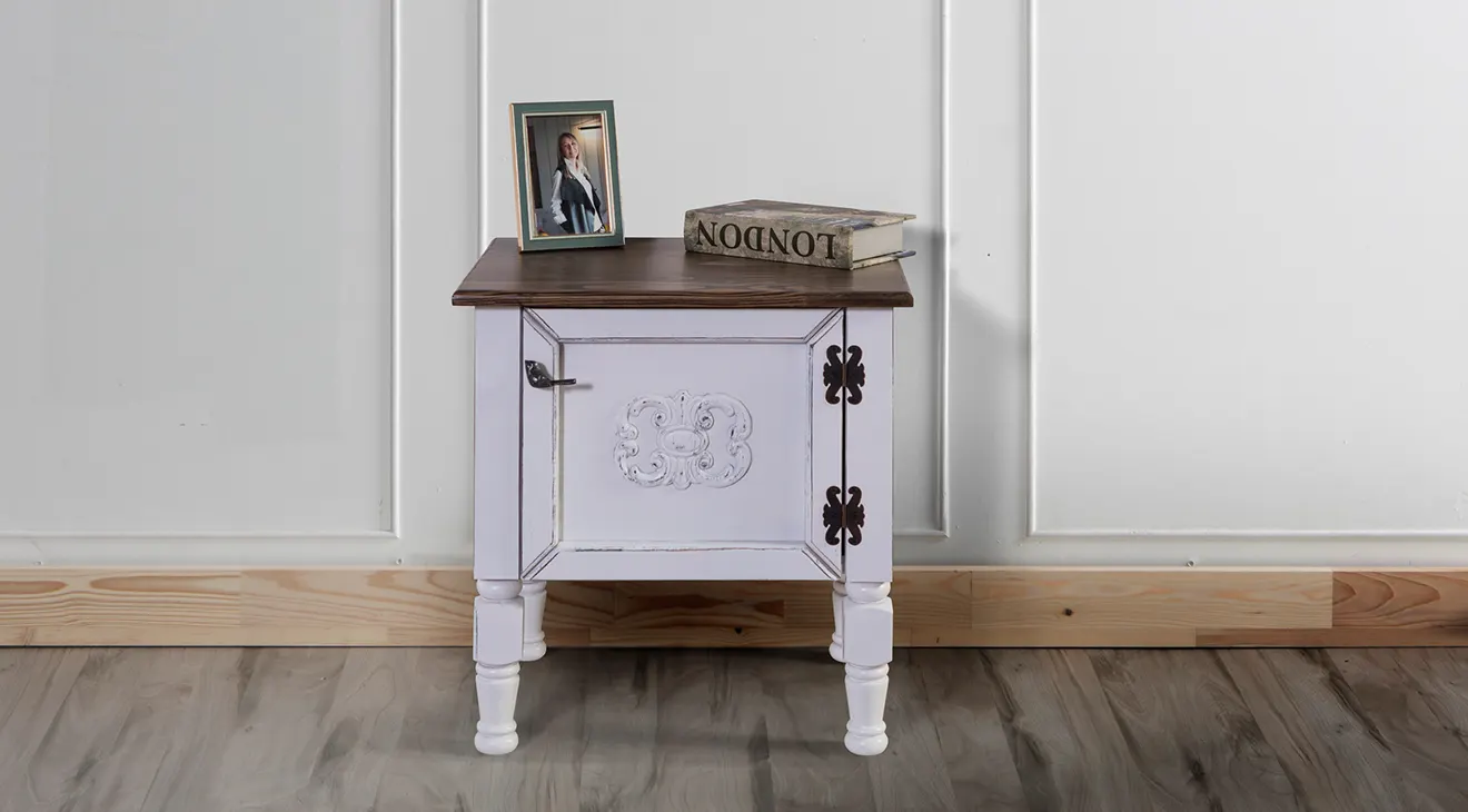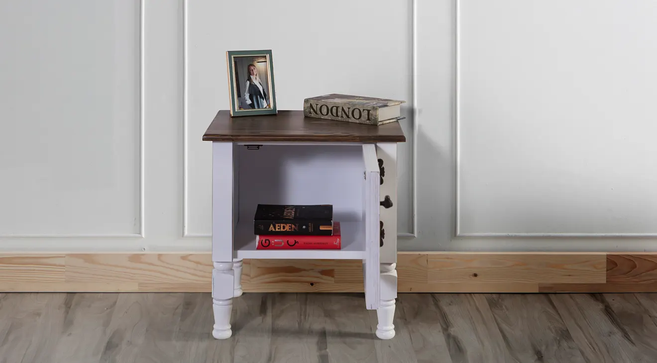 Ada Komodin, eskitme dokulu gövdesi ve kabartma oyma kapak detayıyla klasik bir şıklık sunar. Masif ahşap üst tabla lamba ve aksesuarlar için sağlam bir yüzey sağlarken, kapaklı bölme günlük eşyalarınızı düzenli tutar. Sağlam torna ayaklarıyla yatak odası ve antrelerde uzun ömürlü kullanım sunar.