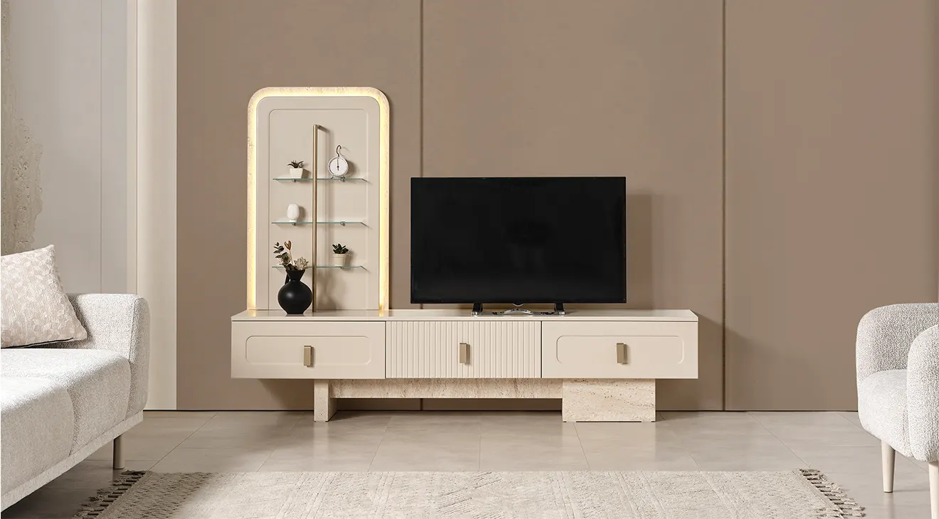 Alaska Tv Ünitesi; sıcak krem rengi ve net çizgileriyle modern bir görünüm sunar. Geniş çekmece ve dolap bölmeleri düzeni kolaylaştırır, kablo geçişi pratik ve şık.