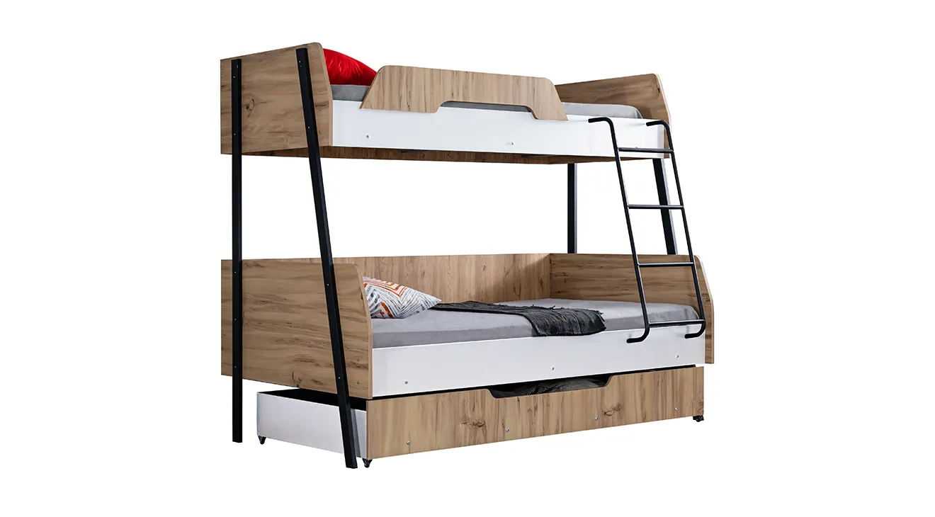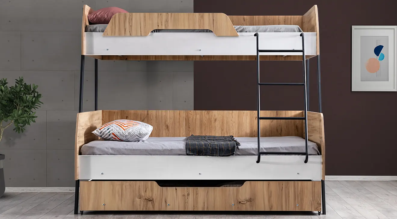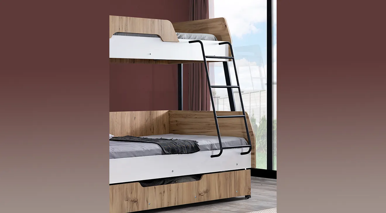 Alba Beyaz Ranza, modern tasarımı ve fonksiyonel yapısıyla çocuk ve genç odaları için ideal bir çözümdür. Ahşap dokusu, beyaz detayları ve dayanıklı metal iskeletiyle hem şıklığı hem de sağlamlığı bir araya getirir. Alt kısmında geniş depolama çekmecesi bulunur, böylece odanızda düzen sağlar. İnegöl mobilya kalitesiyle