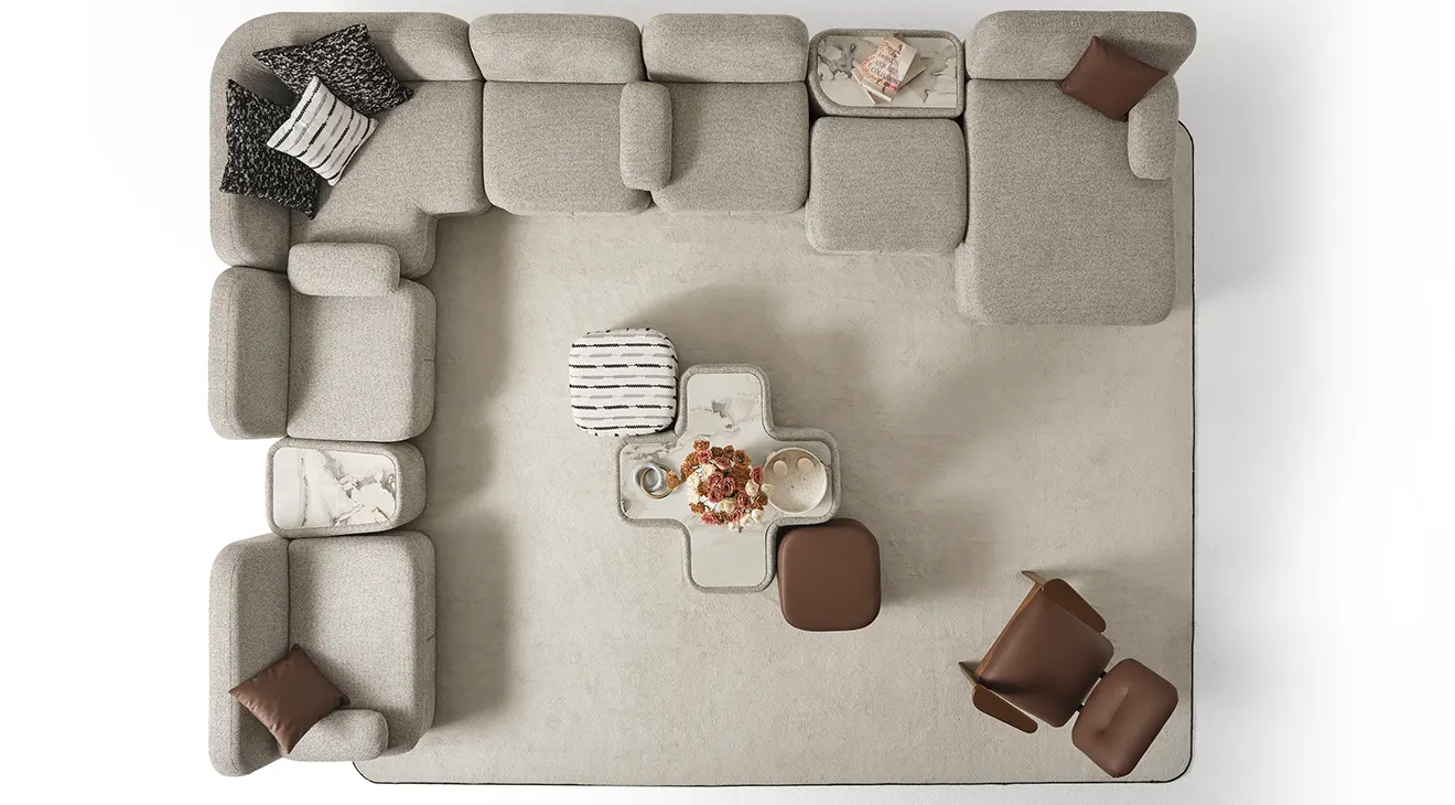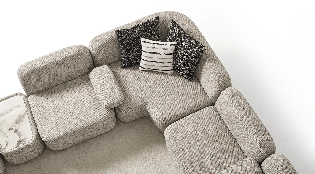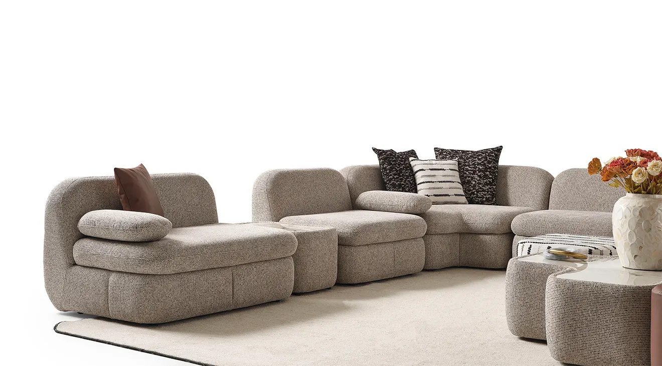 Alfa Köşe Koltuk Takımı, yumuşak dokulu boucle kumaşı ve zarif kavisli hatlarıyla evinize samimi bir konfor sunar. Modüler L‑form tasarım, geniş oturum alanı ve dekoratif minderlerle hem dinlendirici hem de şıklığıyla öne çıkan bir oturma grubu yaratır.
