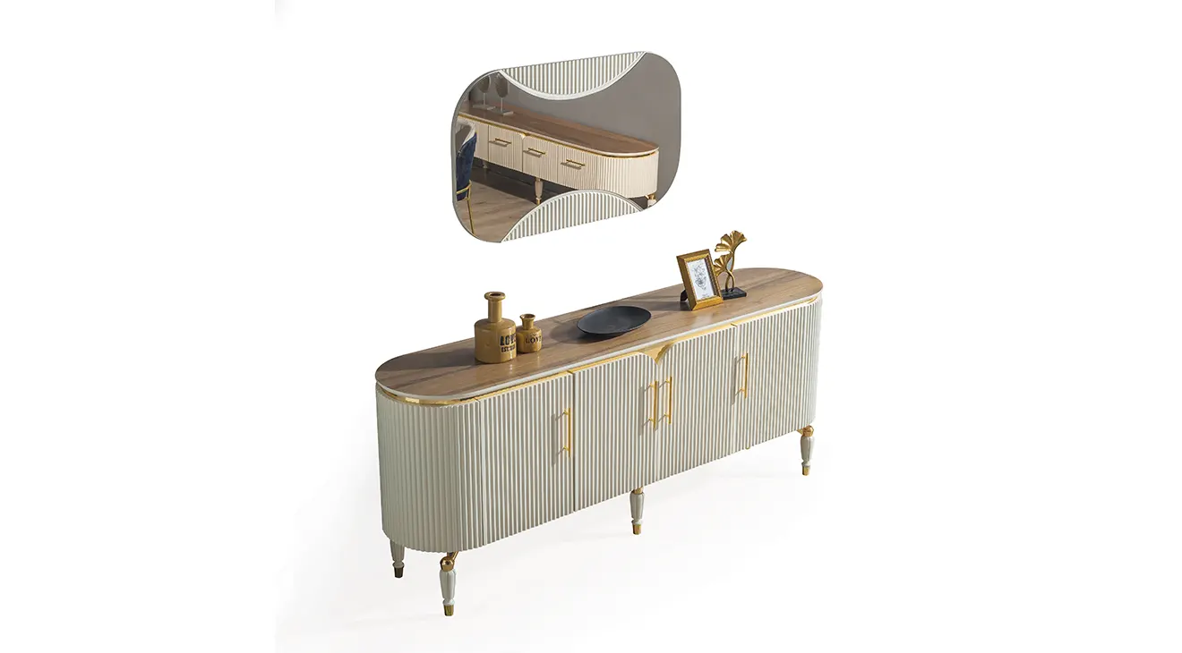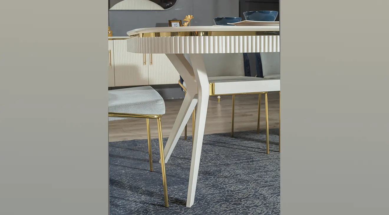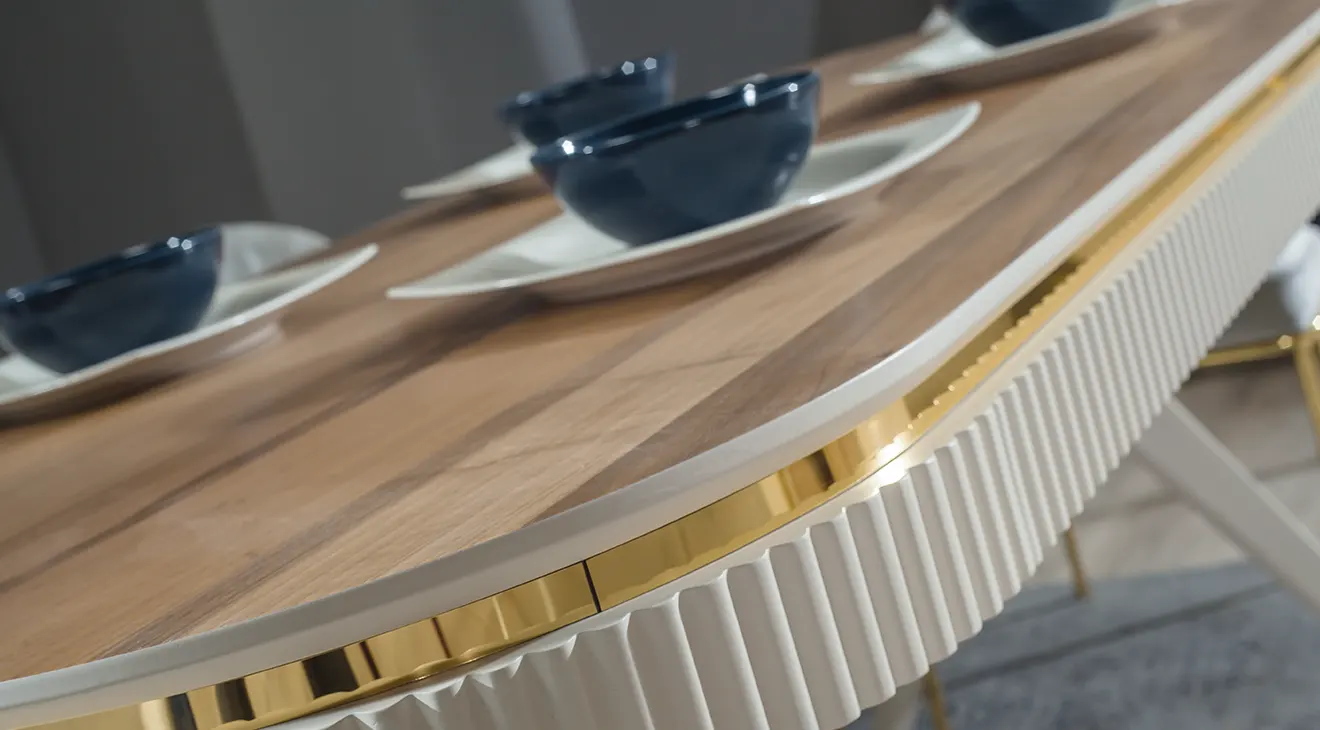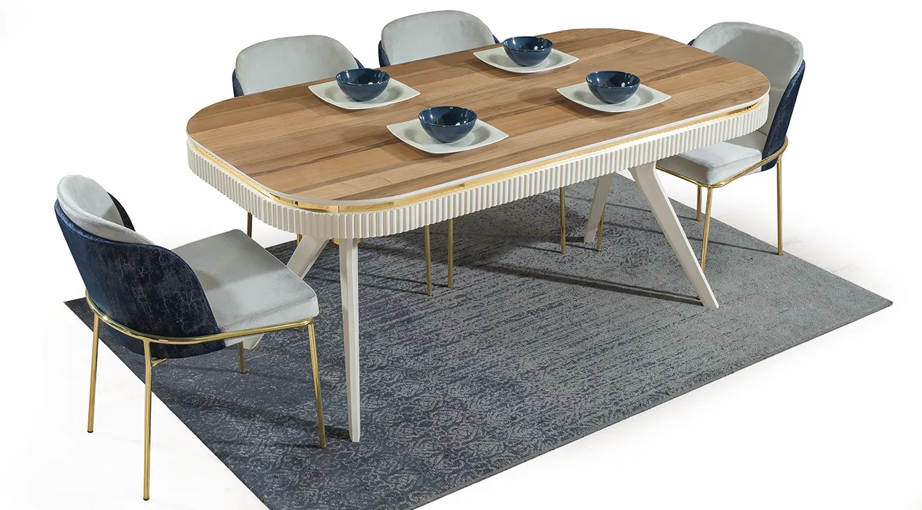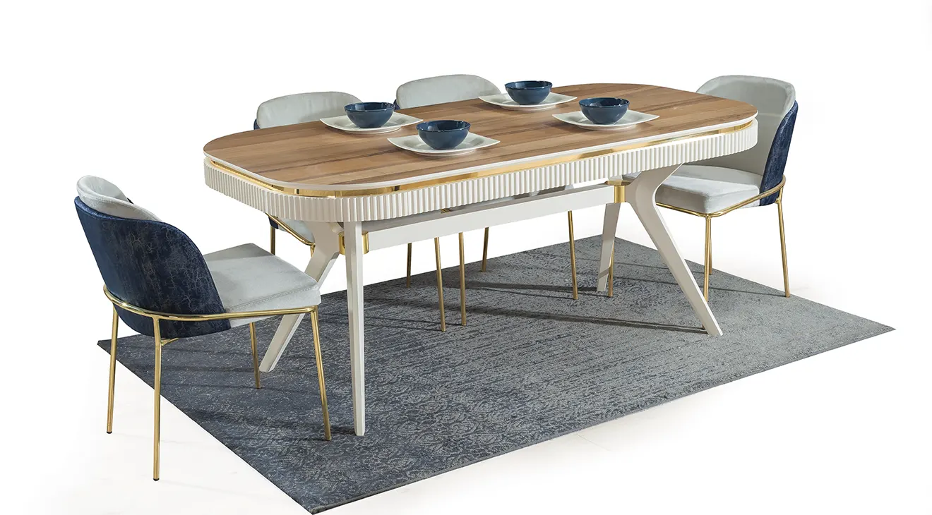 Alyans Modern Yemek Odası Takımı, ince beyaz gövde yüzeyleriyle ferah bir atmosfer yaratır. Ceviz kaplama masası ve altın ayak dekorları, modern çizgilerle klasik dokunuşu birleştirir. Aynı serinin konsol, tv ünitesi ve sehpasıyla uyumlu, her öğününüze sofistike bir dokunuş katacak fonksiyonel bir set.