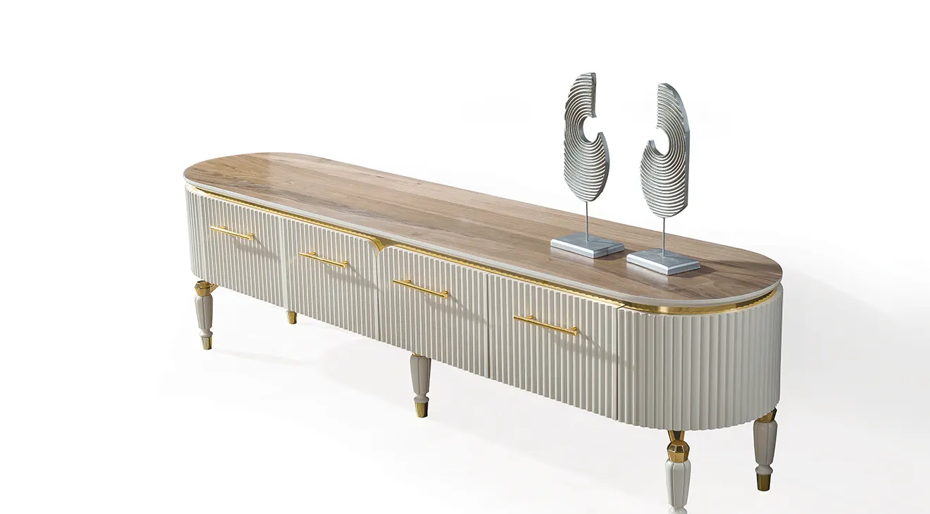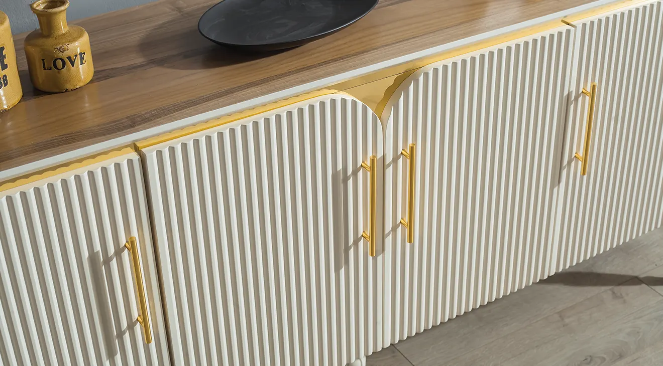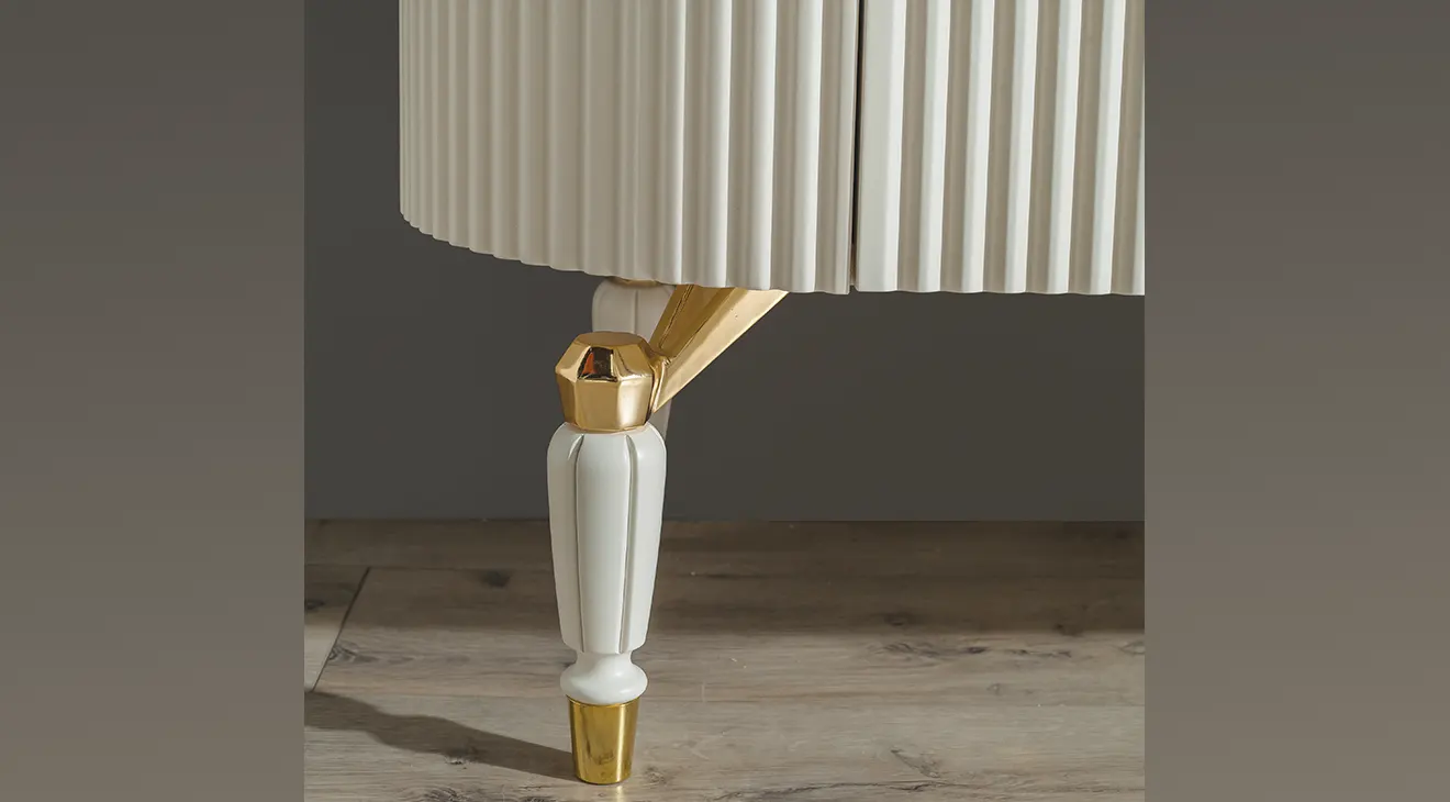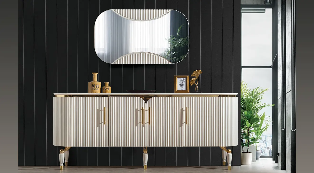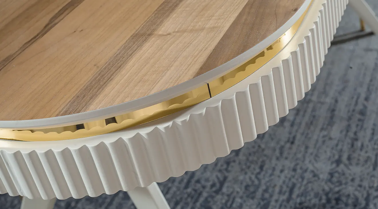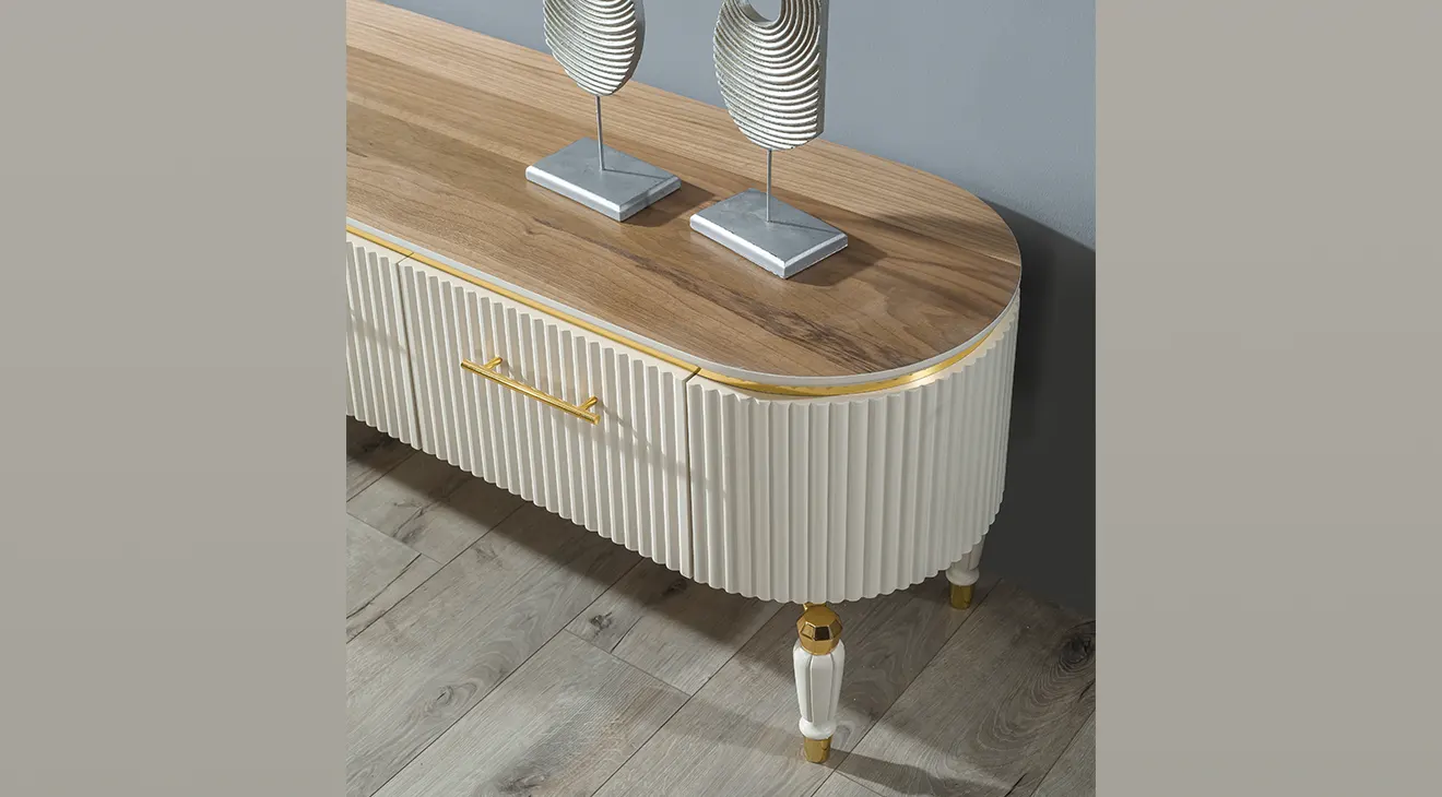 Alyans Modern Yemek Odası Takımı, ince beyaz gövde yüzeyleriyle ferah bir atmosfer yaratır. Ceviz kaplama masası ve altın ayak dekorları, modern çizgilerle klasik dokunuşu birleştirir. Aynı serinin konsol, tv ünitesi ve sehpasıyla uyumlu, her öğününüze sofistike bir dokunuş katacak fonksiyonel bir set.