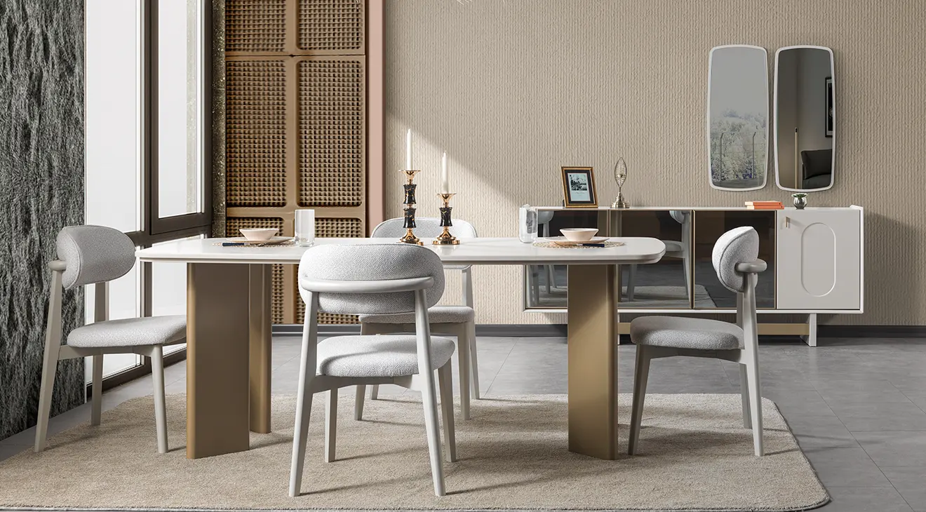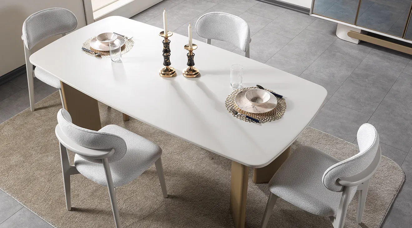 Antik Ahşap Ayaklı Yemek Odası Takımı, zarif metal ayaklı masası ve doğal ahşap dokusunu buluşturan şık tasarımıyla yemek keyfinize modern bir dokunuş katıyor. Yumuşak dokulu, ergonomik sandalyeleri ve cam kapaklı konsolu, hem estetik hem de fonksiyonel bir kullanım sunar. Dayanıklı malzemeleri sayesinde uzun yıllar ilk günkü gibi parlak ve konforlu kalır.
