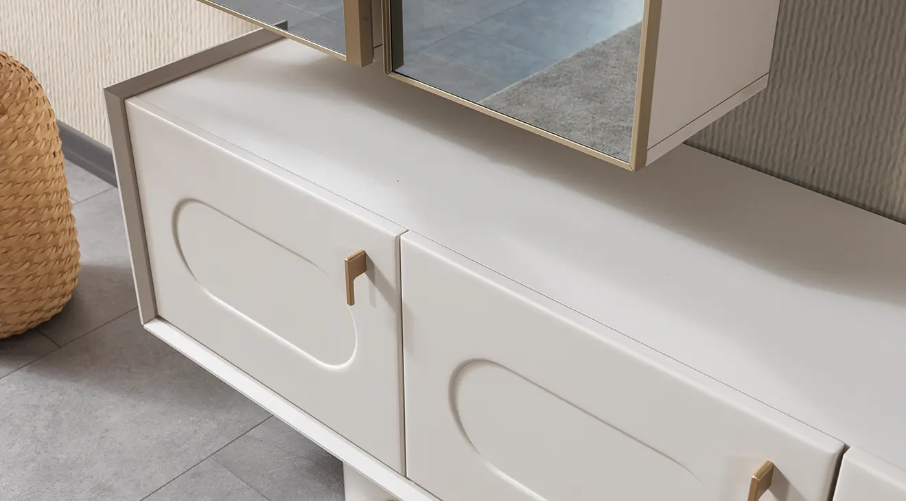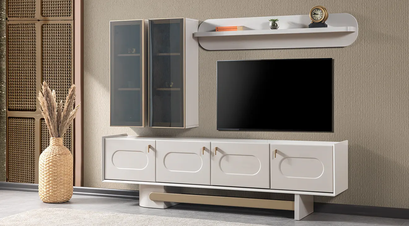 Antik Modern Tv Ünitesi, zarif oval desenli kapakları, altın rengi metal detayları ve mat beyaz yüzeyiyle salonunuza sofistike bir dokunuş katıyor. Alt dolaplardaki geniş saklama alanı, cam kapaklı üst vitrinler ve şık duvar rafı sayesinde hem düzenli hem de estetik bir yaşam alanı sunar.