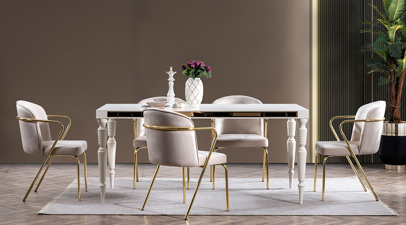İnegöl mobilyasının özel üretimi Arya Ahşap Ayaklı Yemek Odası Takımı, aytaşı renk ve modern tasarımıyla Mobilyamevime'de. Ahşap ayak detayı ile şıklığı evinize taşıyın.