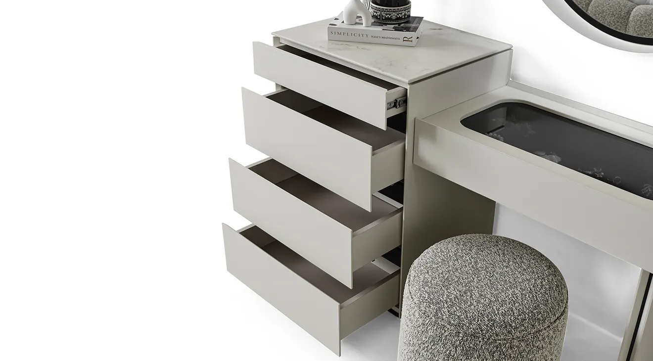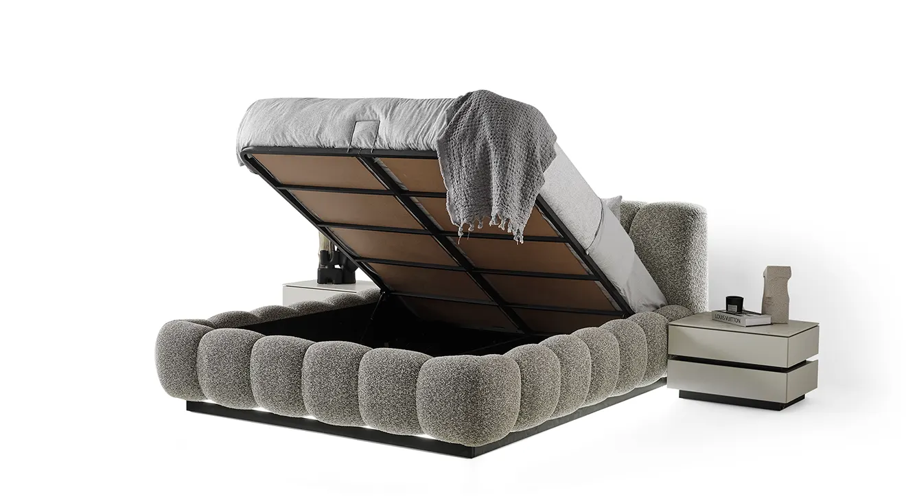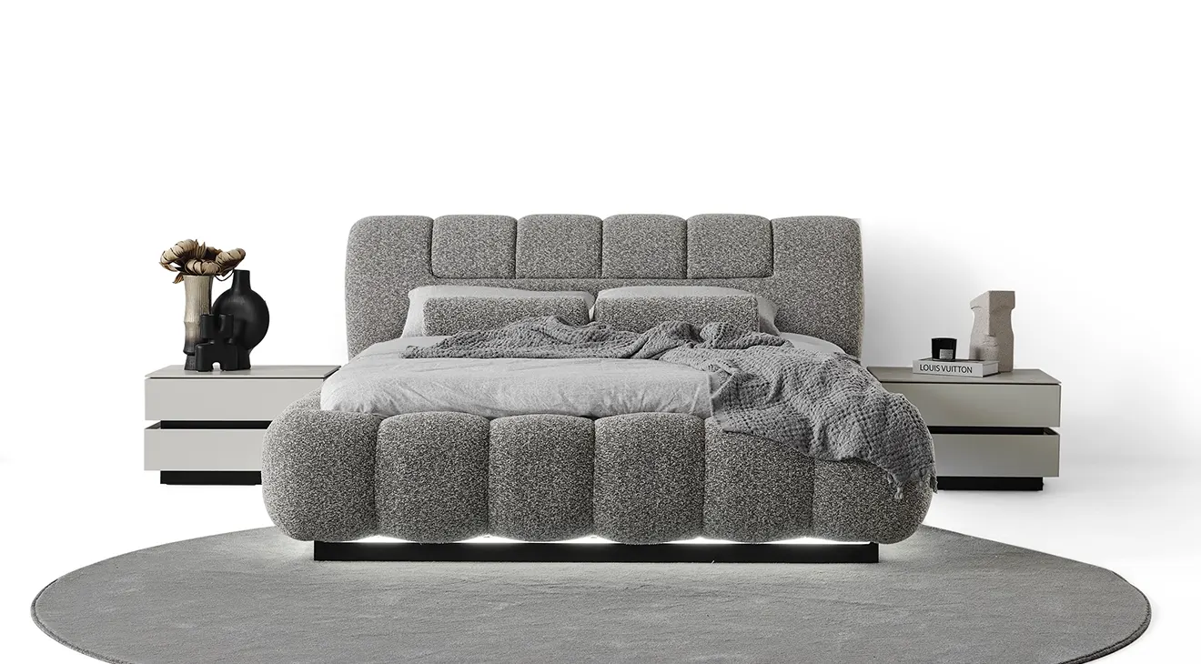 Ashley 6 Kapaklı Yatak Odası Takımı, zarif çizgileri ve cam kapaklı gardırop bölmeleriyle modern bir dokunuş sunar. Yumuşak kumaş yatak başlığı ve LED alt aydınlatmalı baza, hem konforu hem şıklığı bir arada yaşatır.