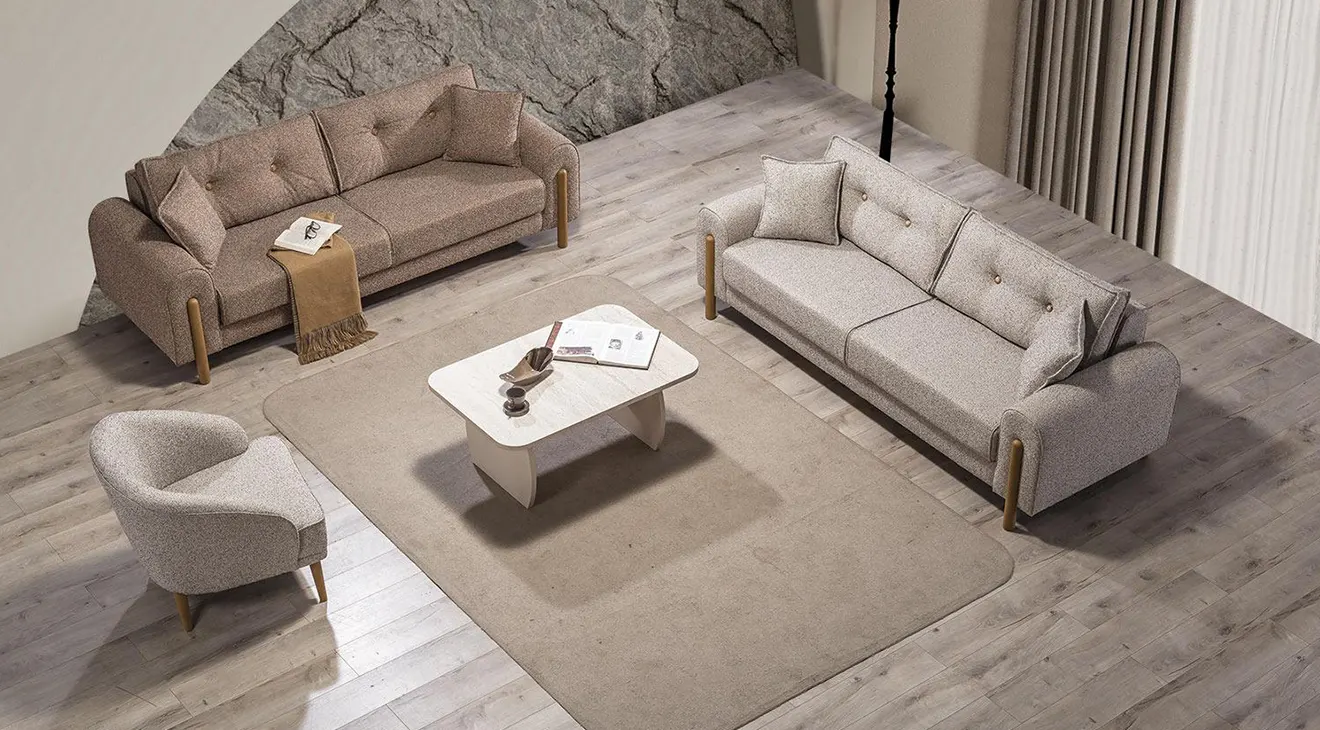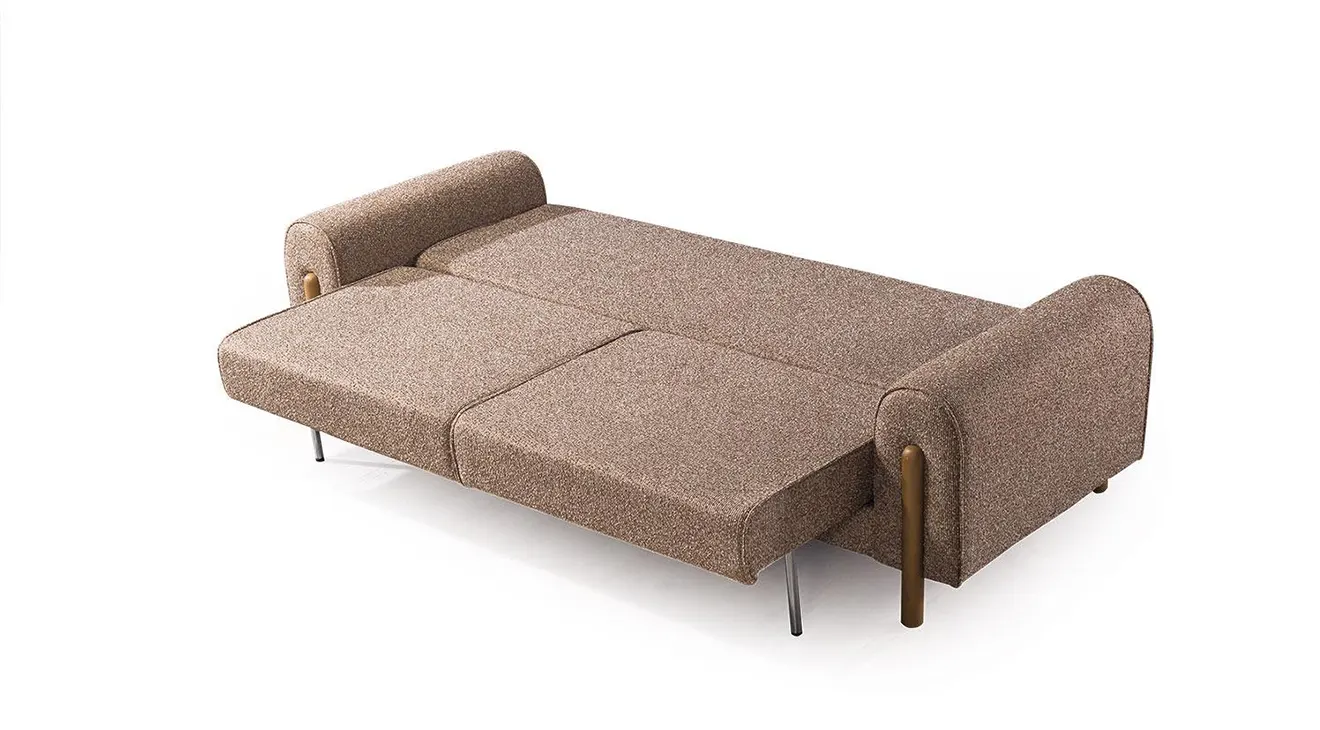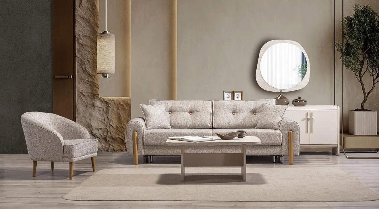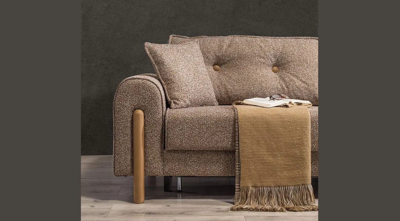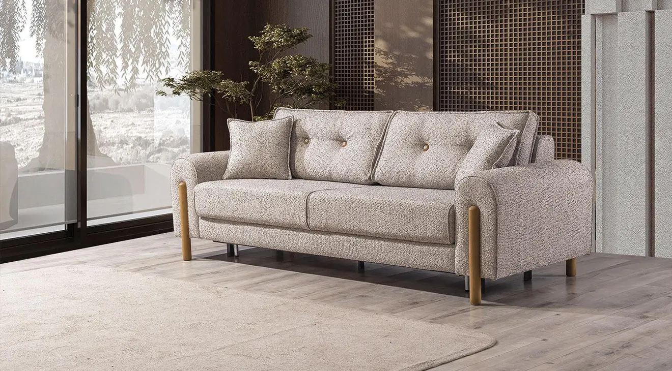 Asya, sıcak dokulu kumaşı ve ahşap ayaklarıyla doğal bir zarafet sunar. Üçlü koltuklar açılarak çift kişilik yatak olur; geniş sandık bölmeleri ise yorgan–yastık gibi eşyaları düzenli tutar. Yumuşak oturum süngeri, destekleyici sırt minderleri ve kolay temizlenen döşemesiyle günlük kullanıma dayanıklıdır. Şık düğme detayları ve silindirik kol yapısı modern-neo klasik çizgiyi tamamlar.