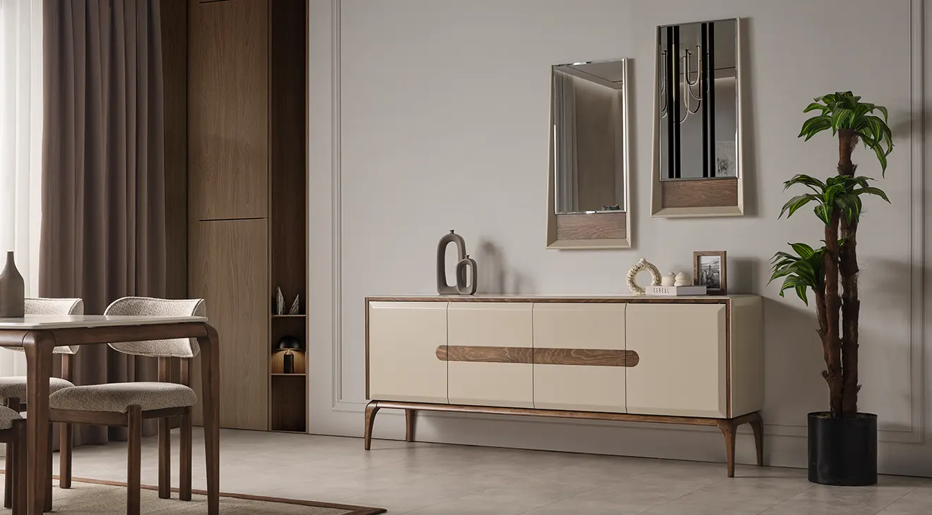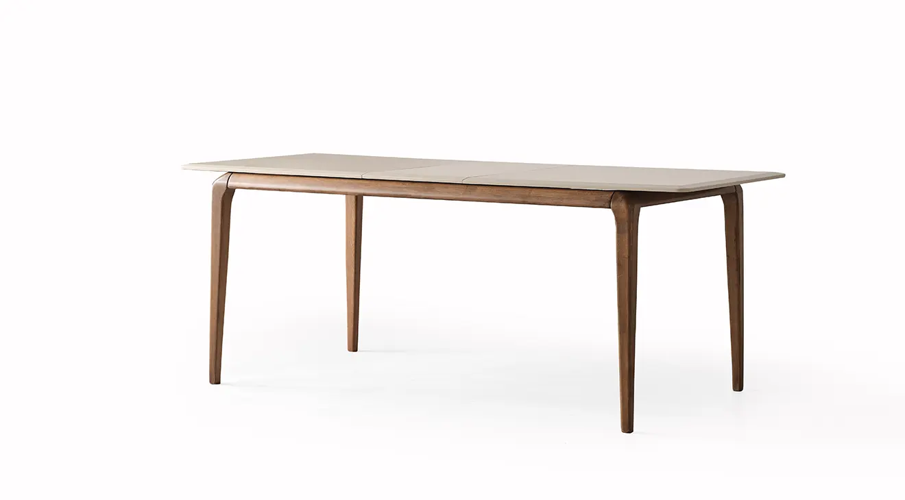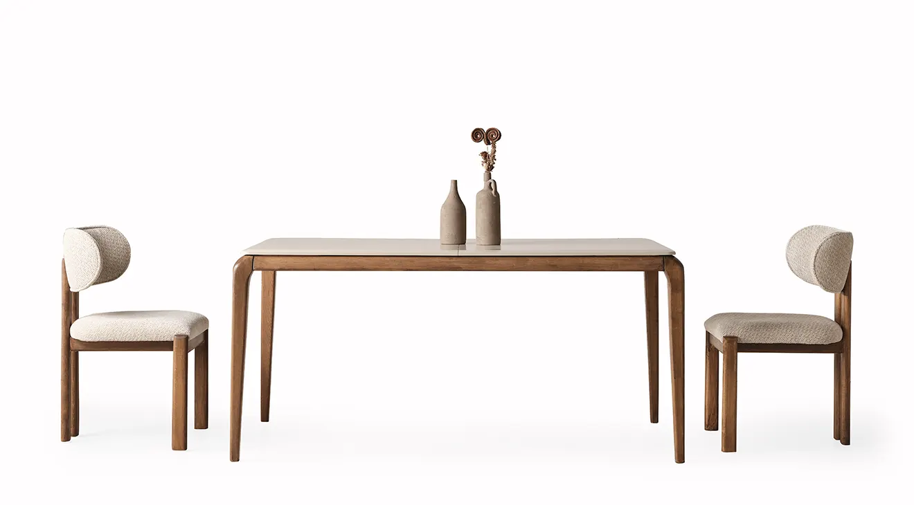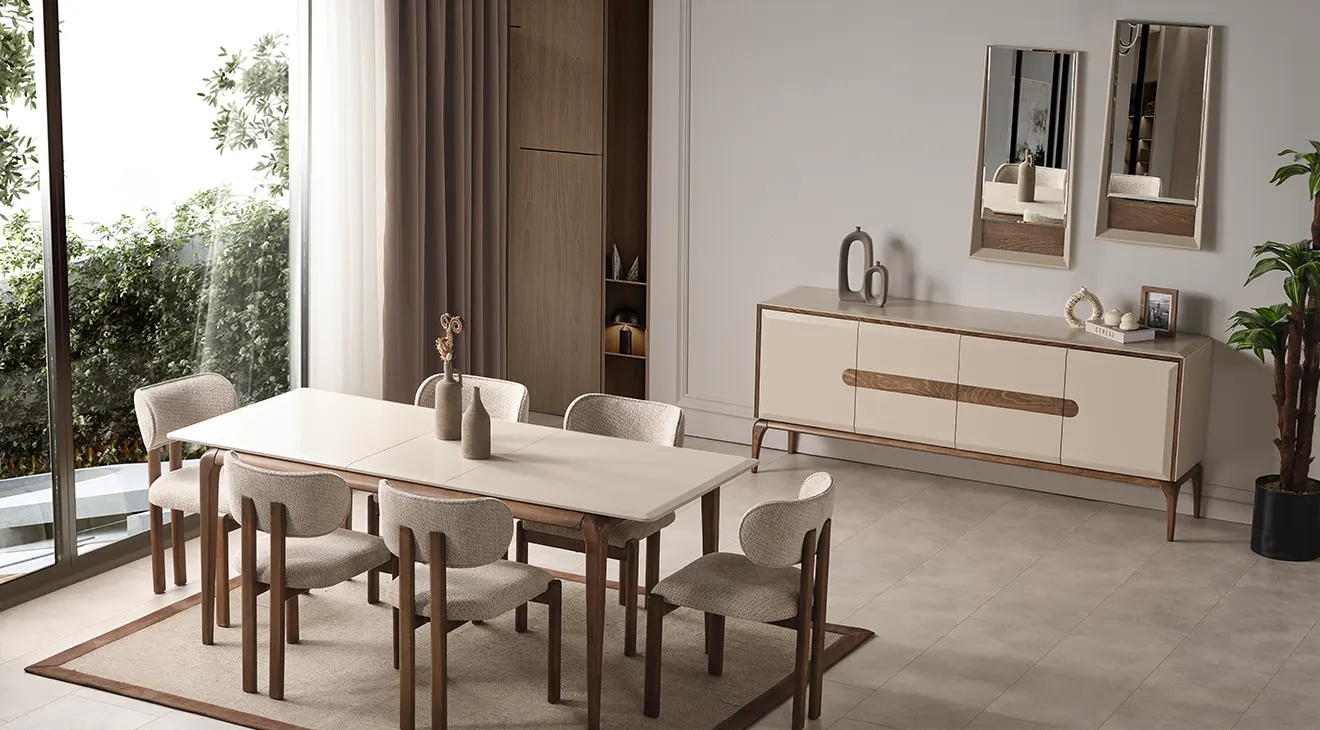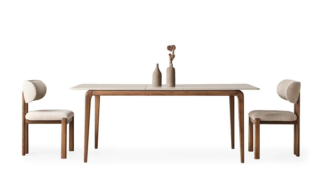 Aura Ahşap Ayaklı Modern Yemek Odası Takımı, ceviz tonlu zarif ayakları ve krem renkli yüzeyiyle sıcak bir davet sunar. Açılır kapanır masası ve konforlu peluş sandalyeleri, yemek davetlerinizi keyifli anlara dönüştürür.
