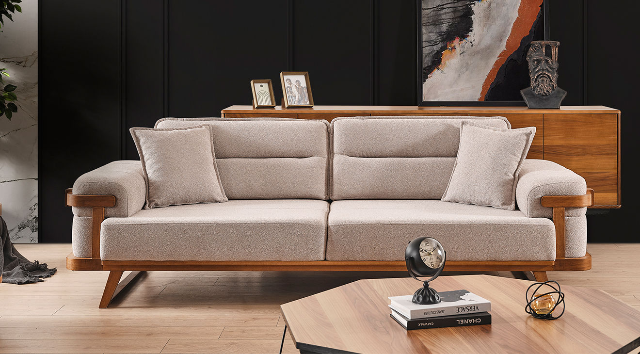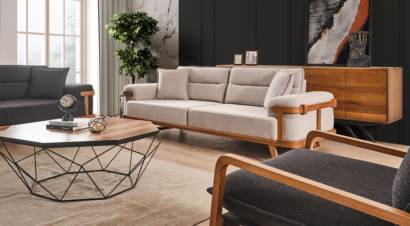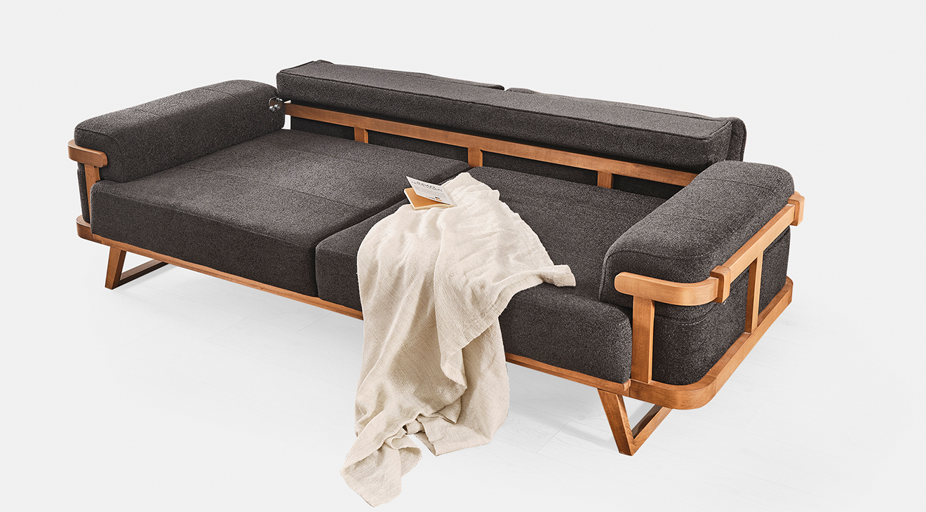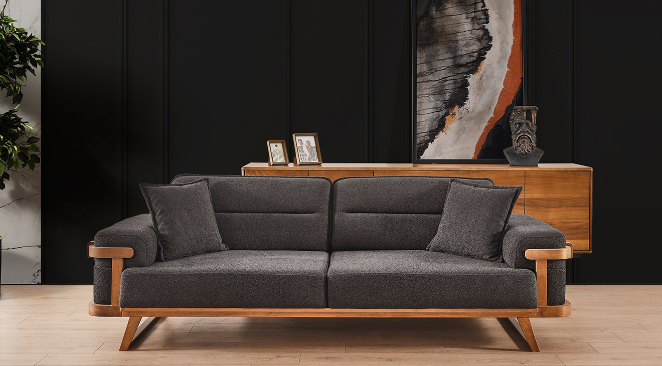 Antrasit ve krem rengi, ceviz ahşap ayakları ve modern tasarımı ile sizlere sunduğumuz Azra Yataklı Modern Koltuk Takımı mobilyamevime.com da