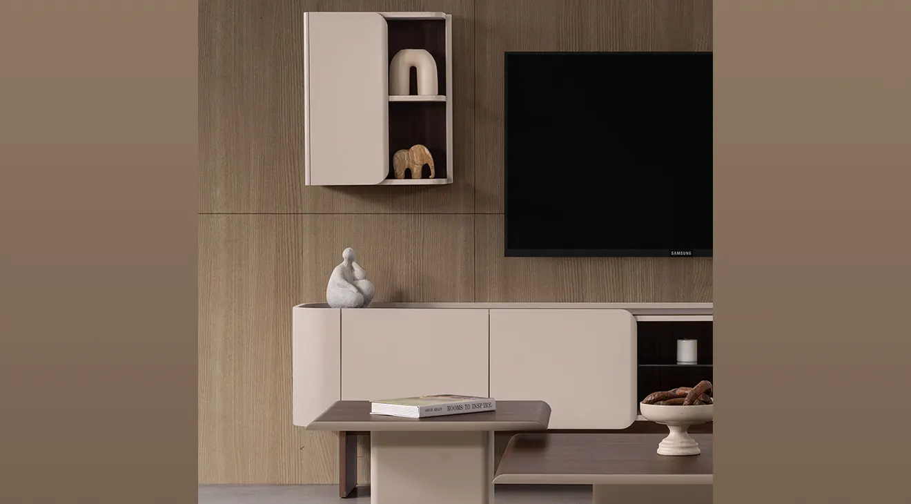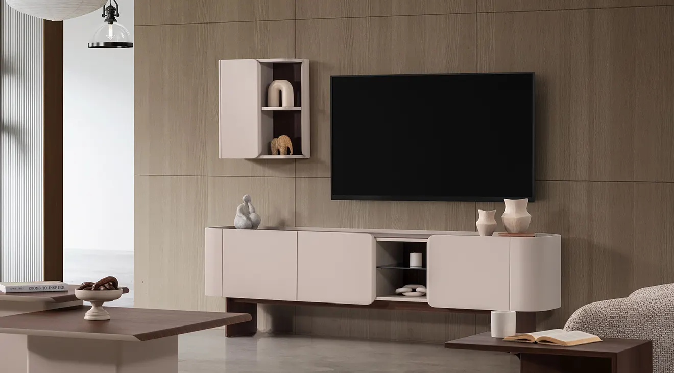 Barcelona Modern TV Ünitesi, yumuşak kenarlı krem kapaklarıyla sıcak bir dokunuş sunar. Açık ceviz iç detaylar ve gizli depolama alanları, şıklığı işlevsellikle buluşturur. Minimalist tasarım, her oturma odasına ferahlık katar.
