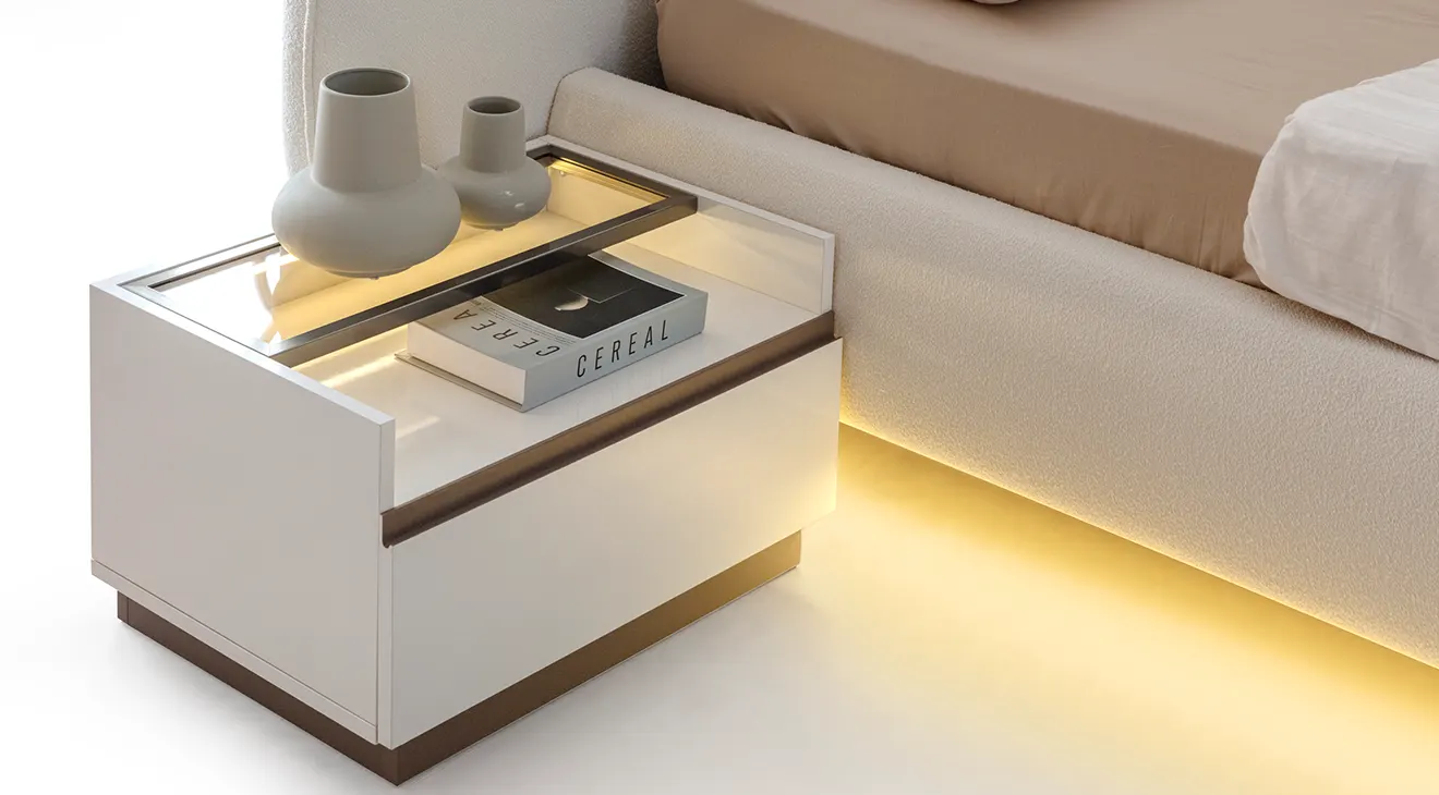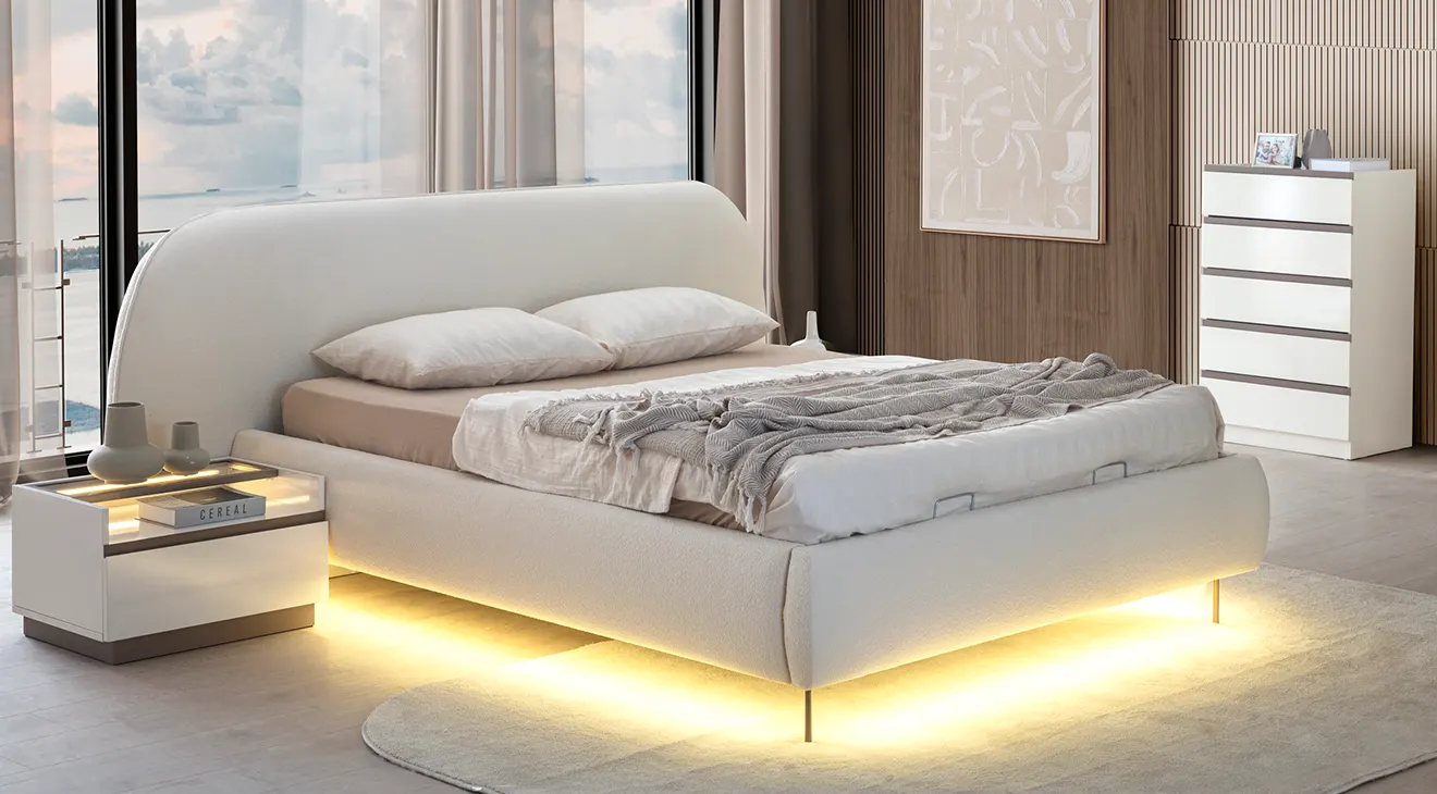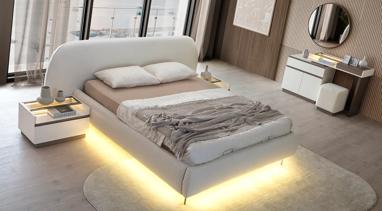 Bellat 6 Cam Kapaklı Yatak Odası Takımı, LED aydınlatmalı modern tasarımı ve geniş cam kapaklı dolabıyla şıklığı ve işlevselliği bir araya getiriyor. Konforlu başlığı ve saklama alanı sunan bazasıyla yatak odanızı daha kullanışlı hale getirir.