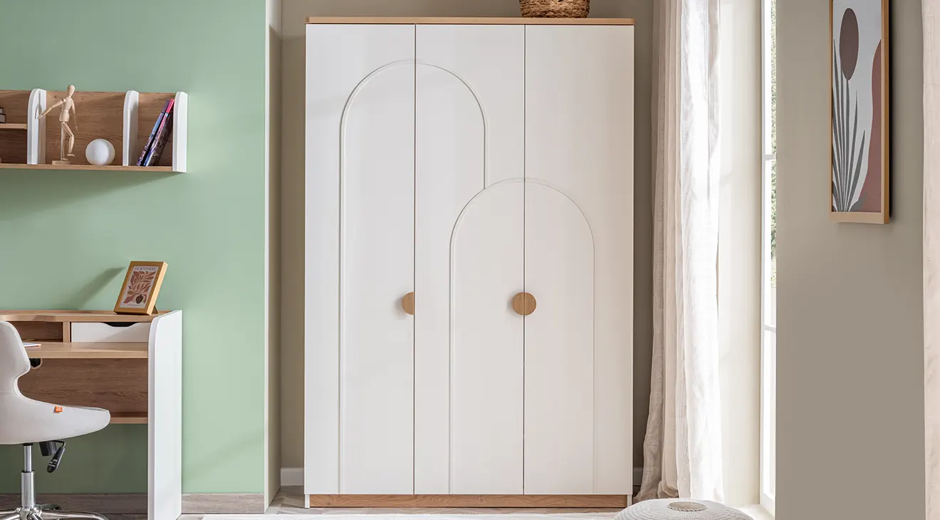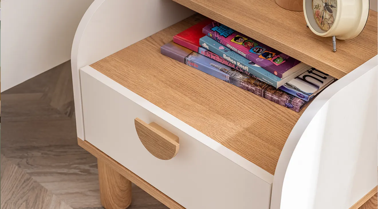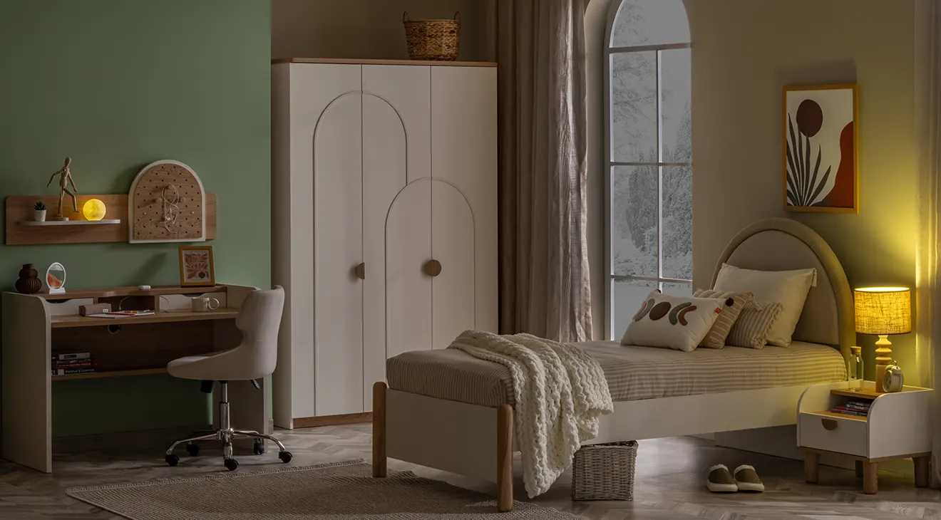 Bohem Genç Odası Takımı, sıcak meşe dokunuşları ve beyaz lake yüzeyiyle iç mekânda ferah bir atmosfer sunar. Kemer detaylı üç kapaklı gardırop, geniş çalışma masası ve konforlu başlıklı karyola, modern genç odalarına şıklık ve fonksiyonellik katar.