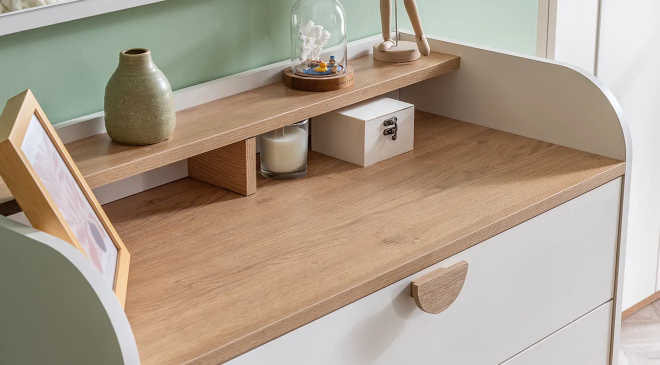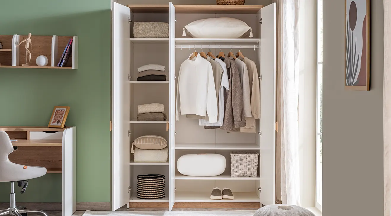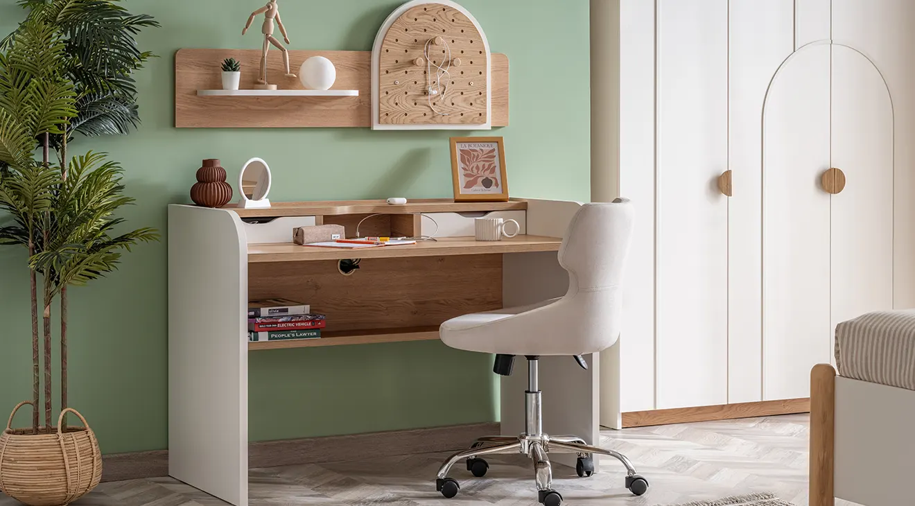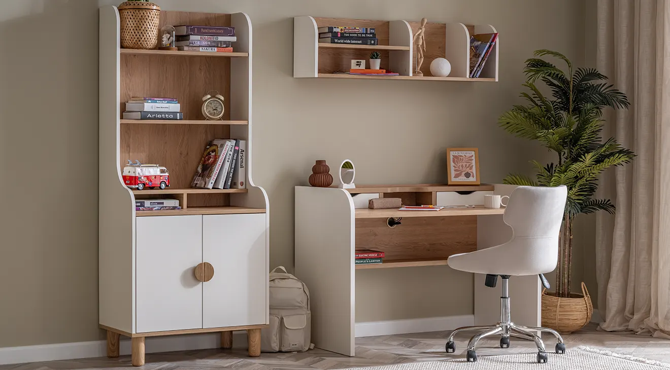 Bohem Genç Odası Takımı, sıcak meşe dokunuşları ve beyaz lake yüzeyiyle iç mekânda ferah bir atmosfer sunar. Kemer detaylı üç kapaklı gardırop, geniş çalışma masası ve konforlu başlıklı karyola, modern genç odalarına şıklık ve fonksiyonellik katar.
