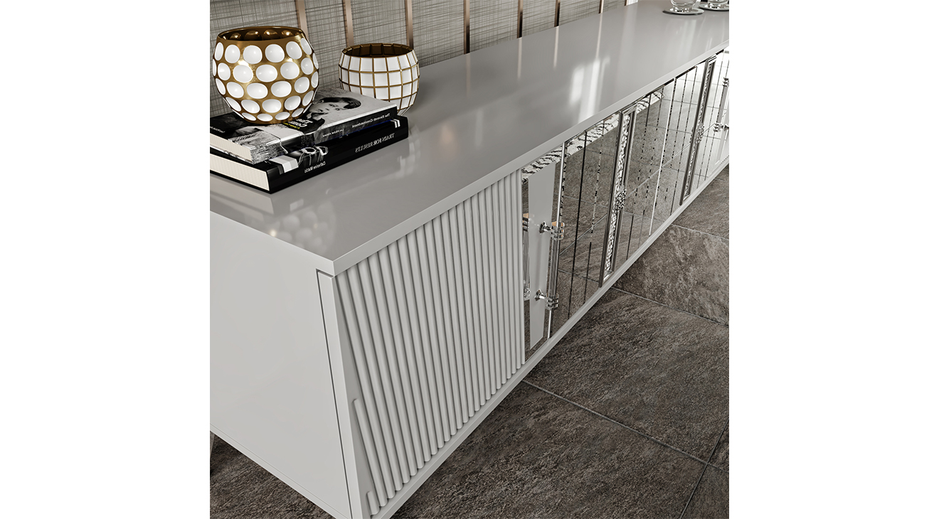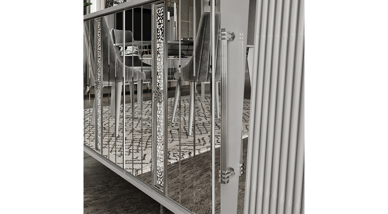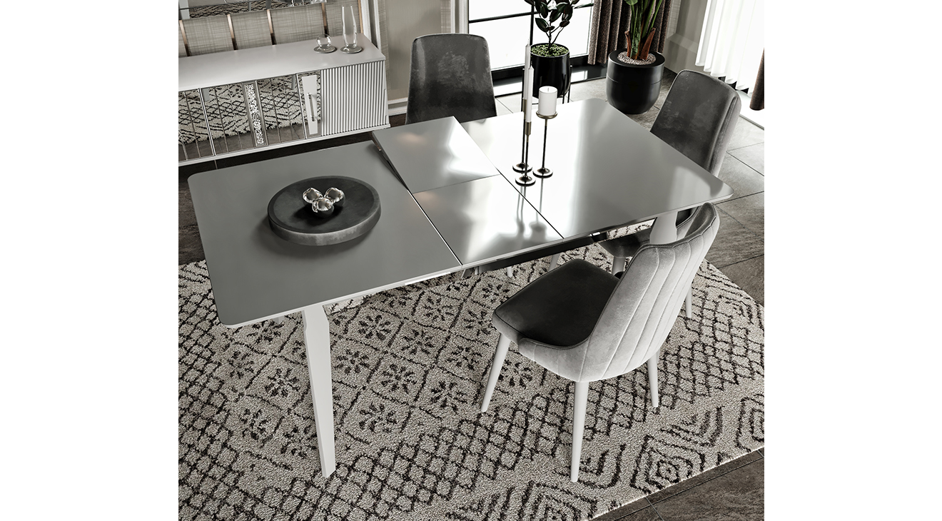 Bostancı Sis Grisi Yemek Odası Takımı, modern tasarımı, gri rengi ve özel tasarım konsolu ile İnegöl Mobilya markalı özel üretim ürünlerinden.