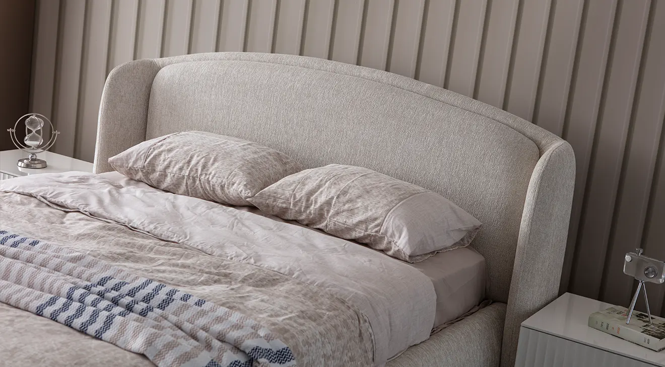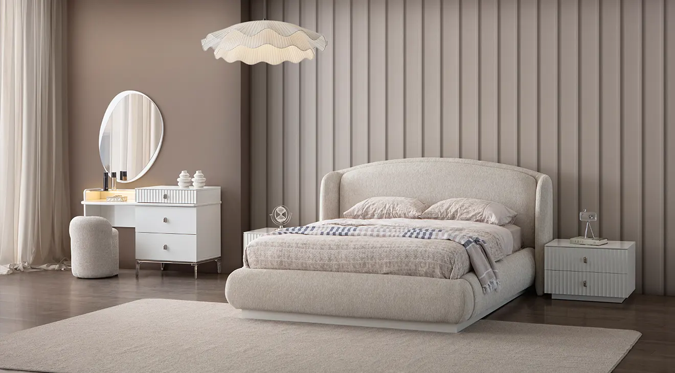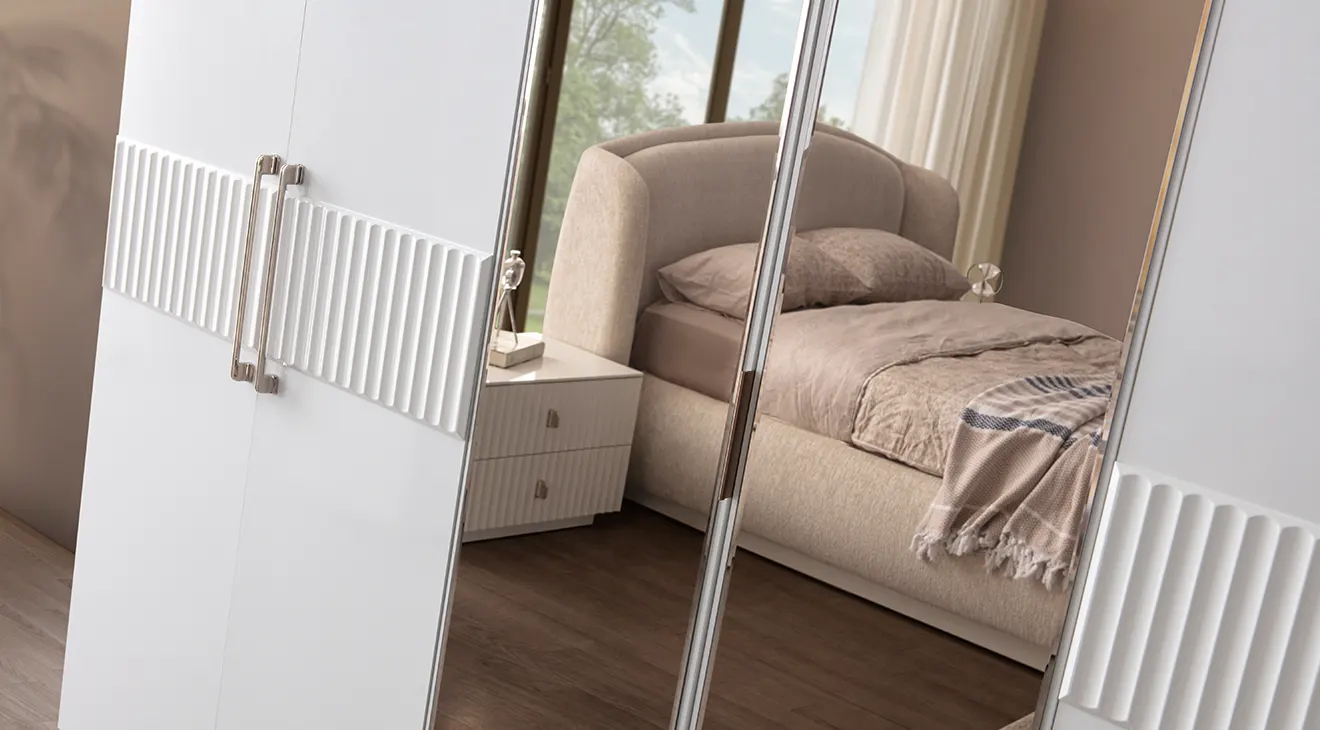 Bronz 6 Kapaklı Modern Yatak Odası Takımı; bazalı yatak, aynalı dolap ve şık şifonyerle düzeni artırır, açık tonlarıyla odayı aydınlatır.