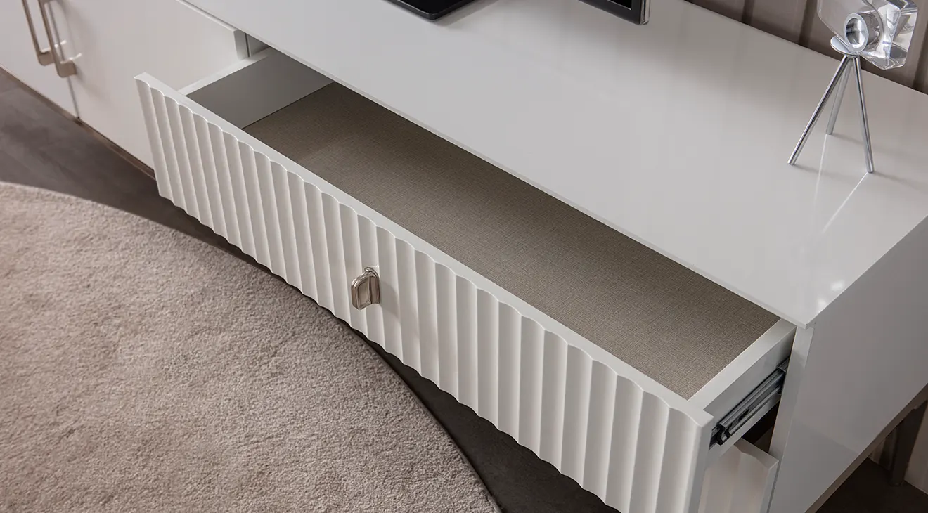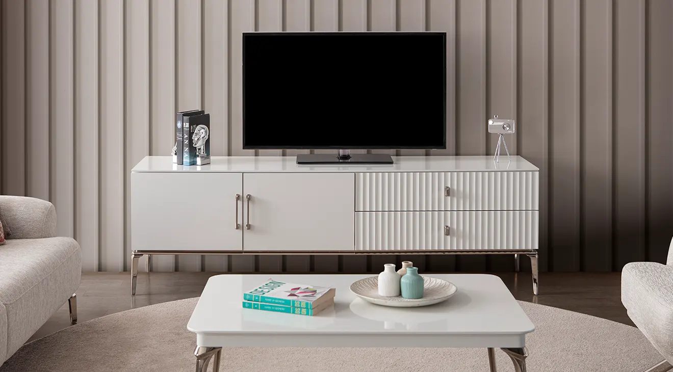 Bronz Metal Ayaklı Modern TV Ünitesi; parlak beyaz gövde, yivli çekmeceler ve kapaklı depolamayla salonu toparlar, kabloları gizler.
