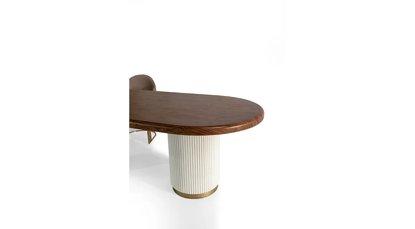 Calista Oval Yemek Masası, ahşap üst yüzeyi ve zarif beyaz altının detaylı ayaklarıyla modern bir dokunuş sunar. Şık tasarımıyla yemek alanınıza estetik bir hava katın.