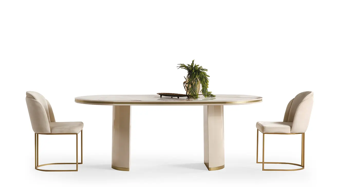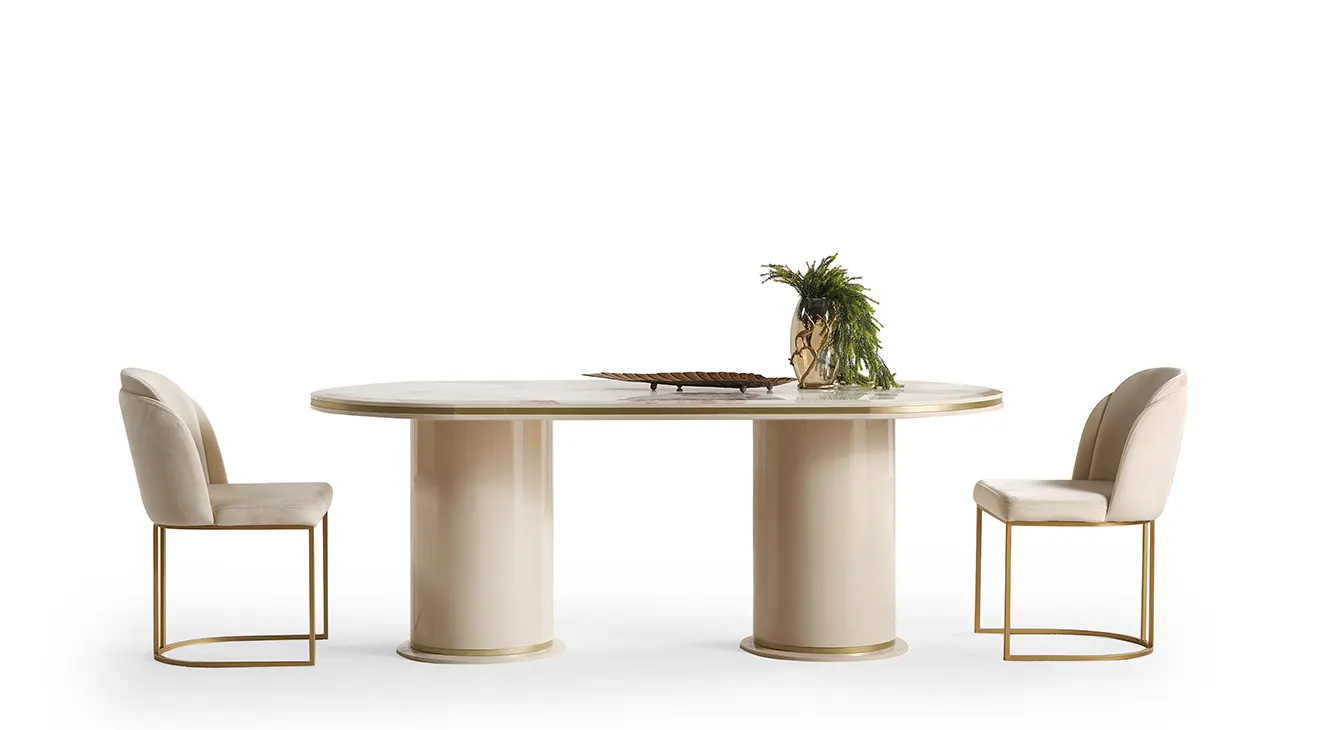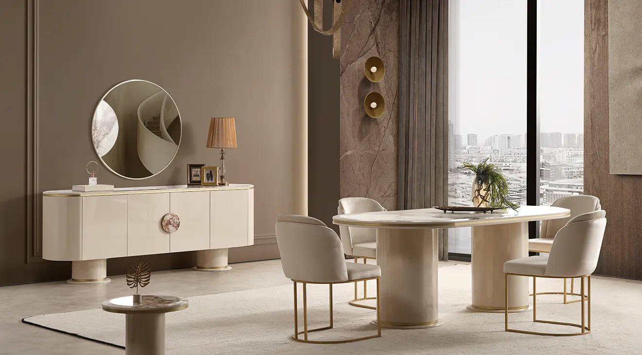 Cartier Vizon Yemek Odası Takımı, modern çizgileri ve sıcak vizon tonuyla yaşam alanınıza zarif bir dokunuş katıyor. Mermer desenli geniş masası, kadife kaplı konforlu sandalyeleri ve şık depolama konsoluyla estetik ve fonksiyonelliği bir arada sunar.