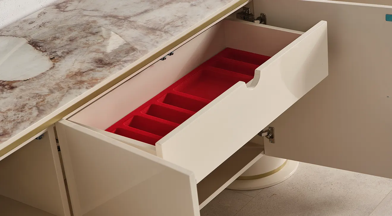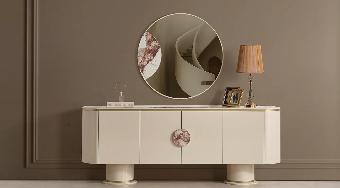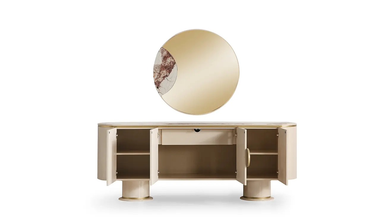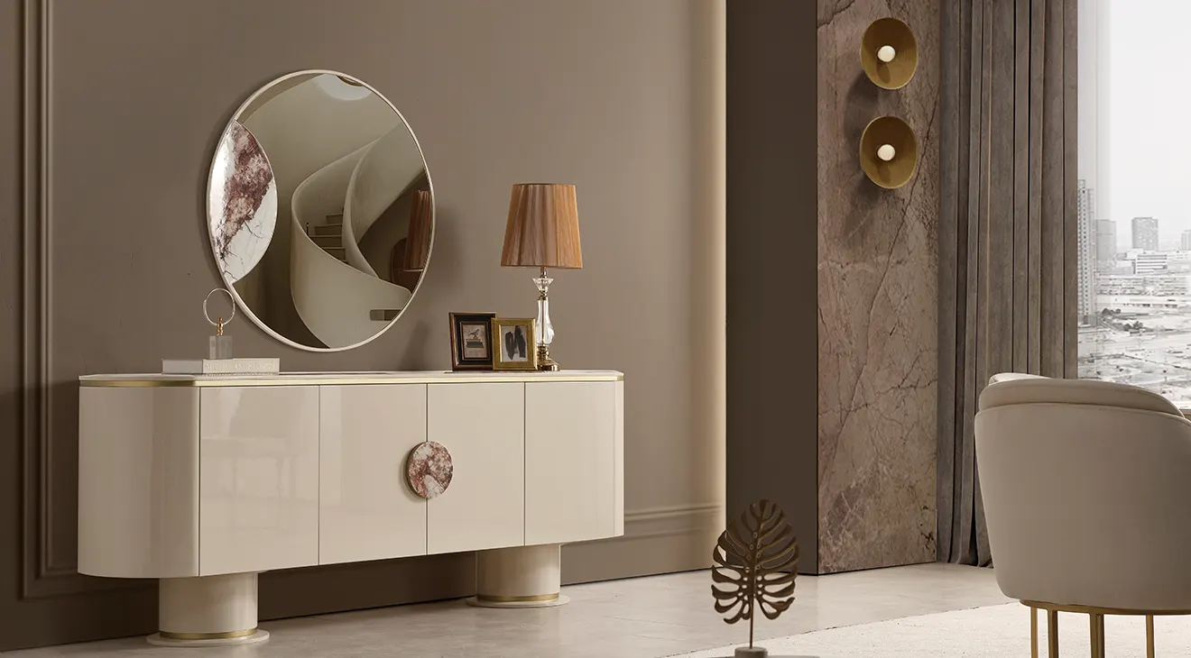 Cartier Vizon Yemek Odası Takımı, modern çizgileri ve sıcak vizon tonuyla yaşam alanınıza zarif bir dokunuş katıyor. Mermer desenli geniş masası, kadife kaplı konforlu sandalyeleri ve şık depolama konsoluyla estetik ve fonksiyonelliği bir arada sunar.