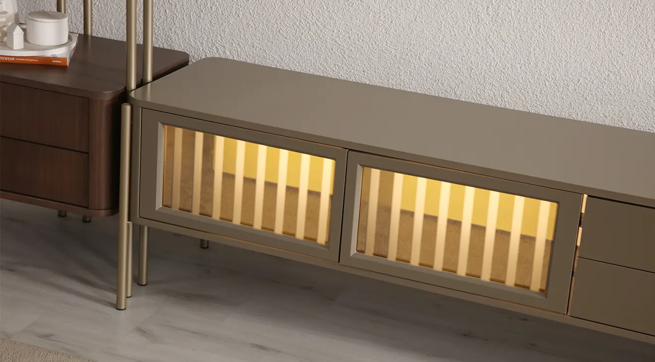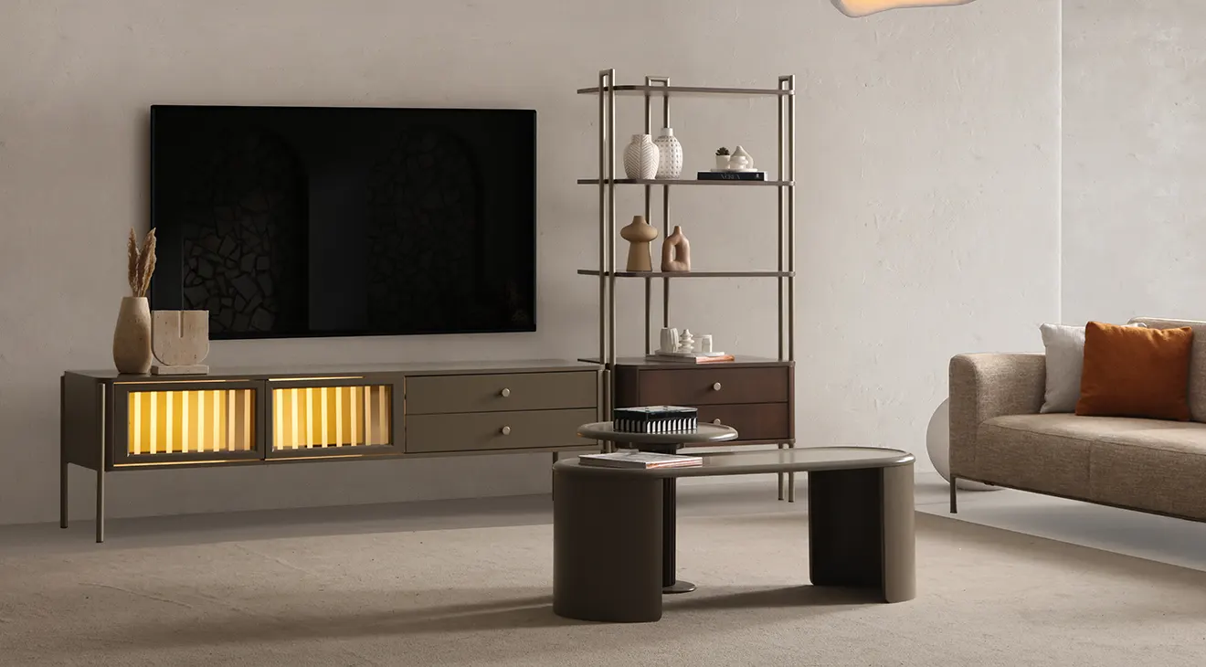 Colt Modern Ceviz TV Ünitesi, ceviz tonları ve zarif metal detaylarıyla salonda modern ve sofistike bir atmosfer oluşturur. Cam panelli, dekoratif aydınlatmalı kapaklar TV alanına sıcak bir ışıltı katarken, geniş çekmeceler ve açık raflar hem medya ekipmanları hem de dekor objeleri için düzenli depolama sunar. Yüksek ayak yapısı temizliği kolaylaştırır; dayanıklı gövde ve kolay silinebilir yüzeyler, İnegöl mobilya kalitesini yıllarca ilk günkü şıklığıyla korur.