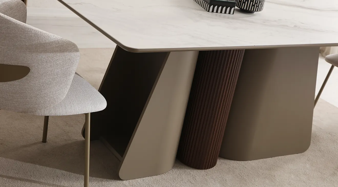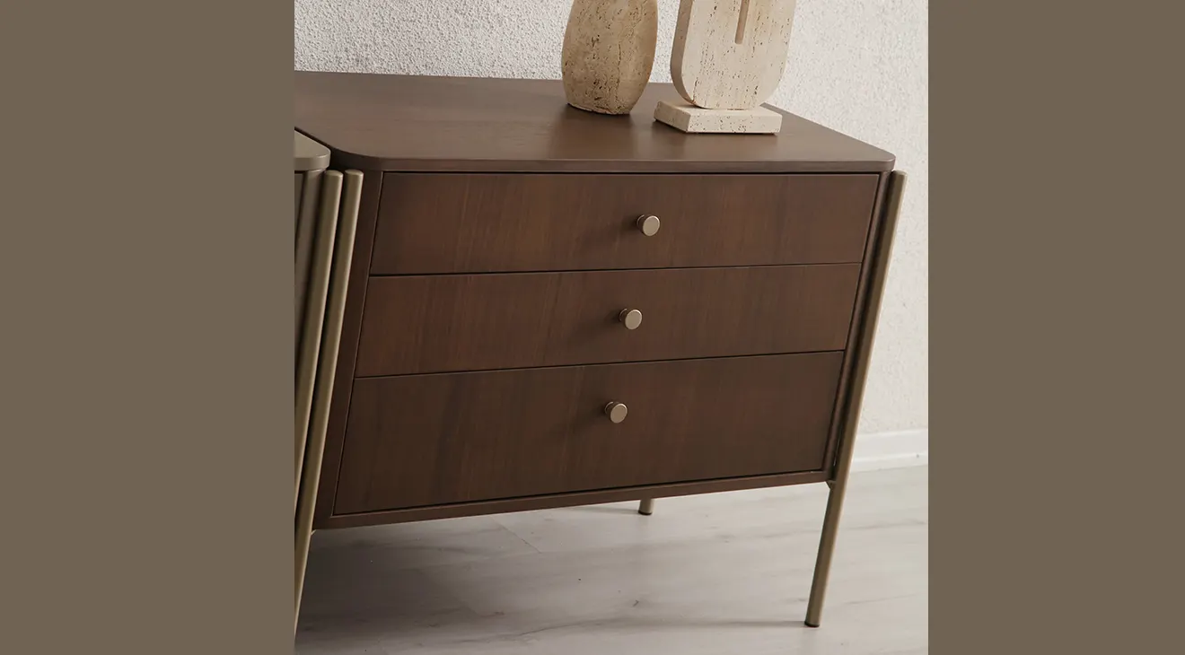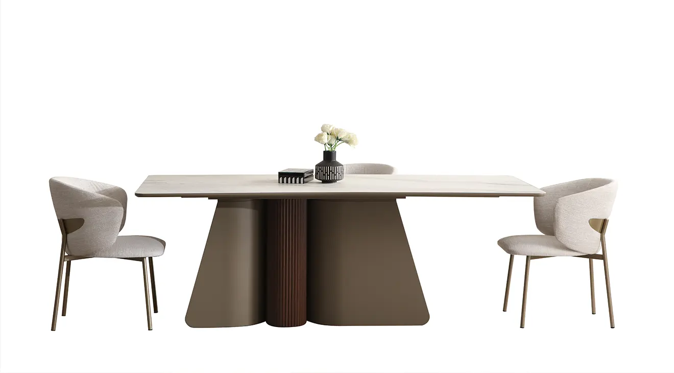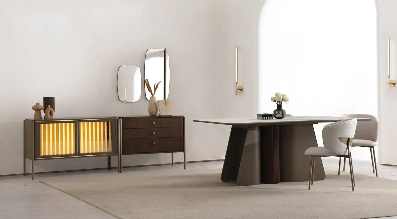 Colt Modern Ceviz Yemek Odası Takımı, koyu ceviz yüzeyleri ve yumuşak bej tonlarıyla sıcak, sofistike bir yemek alanı oluşturur. Heykelsi formdaki masa ayağı ve geniş tabla, kalabalık aile sofraları için hem sağlam hem konforlu kullanım sunar. LED aydınlatmalı sürgülü cam kapaklı konsol ve geniş çekmeceli dresuar, depolama ve sergilemeyi bir arada sağlayarak mekâna modern bir vurgu katar. Dayanıklı malzemeler ve kolay temizlenen yüzeyler sayesinde takım, yıllarca ilk günkü şıklığını korur.