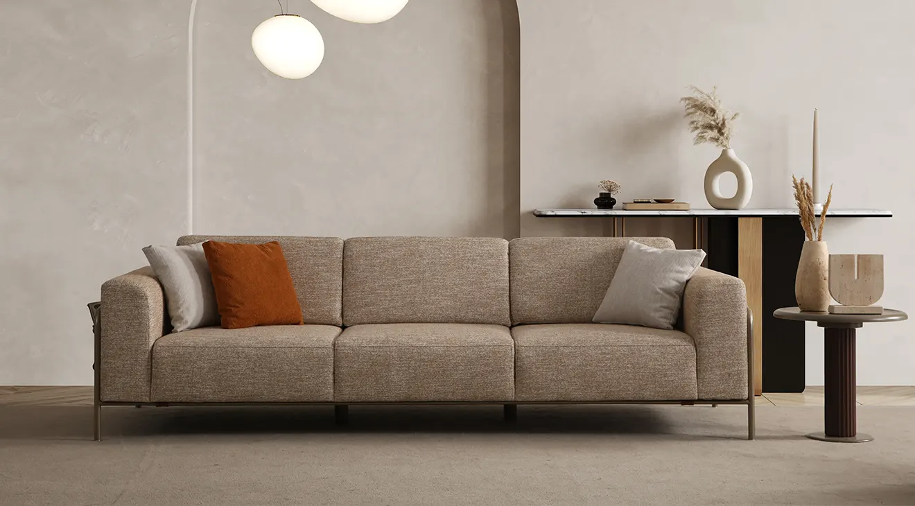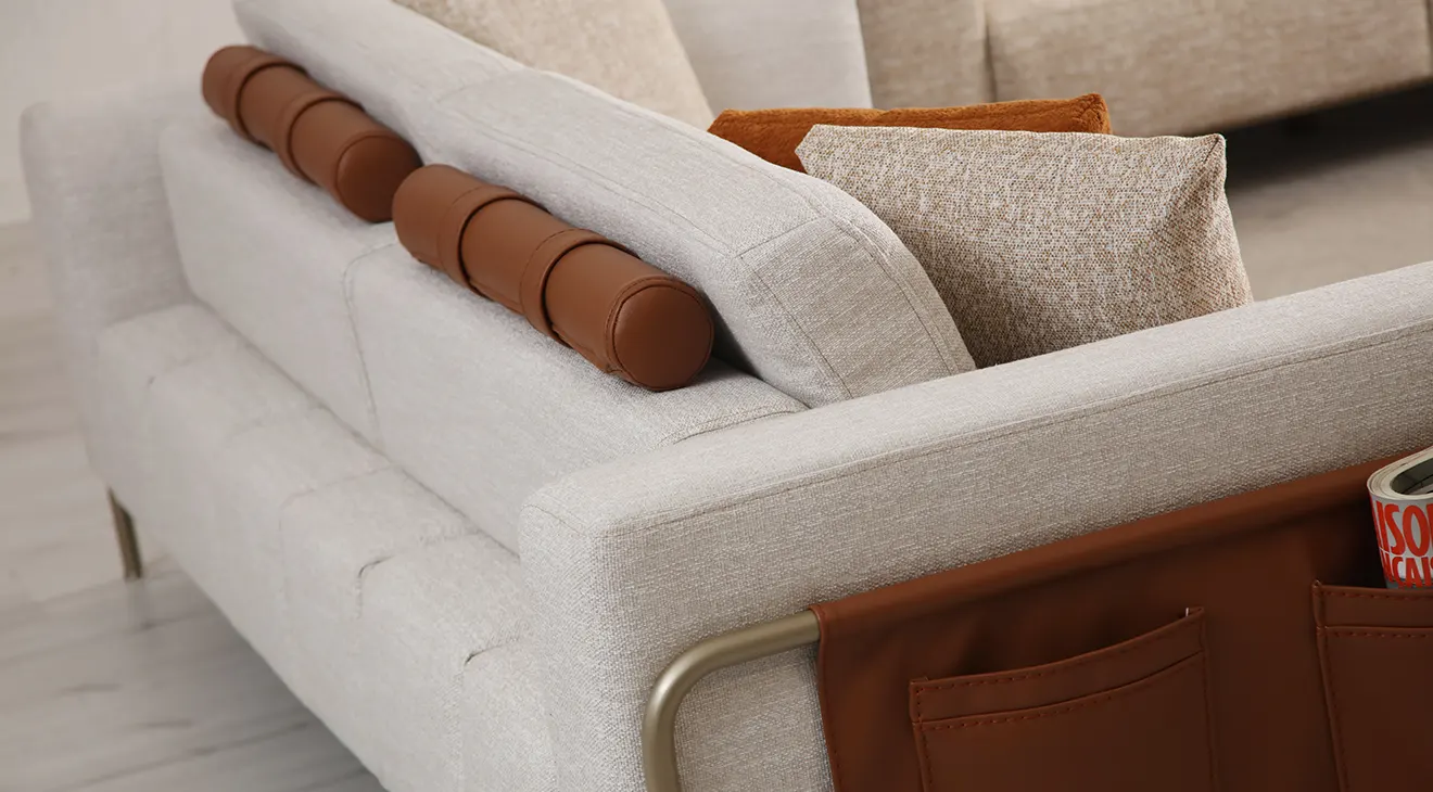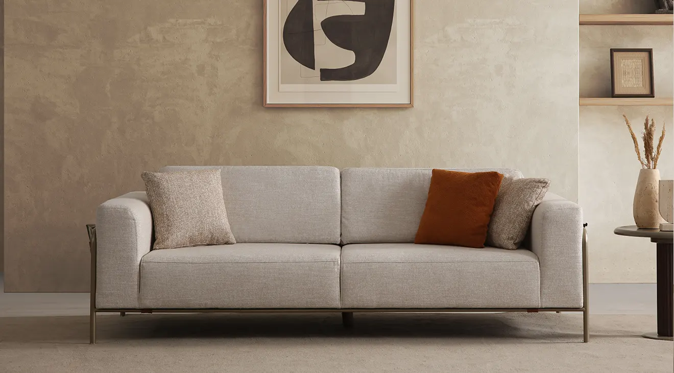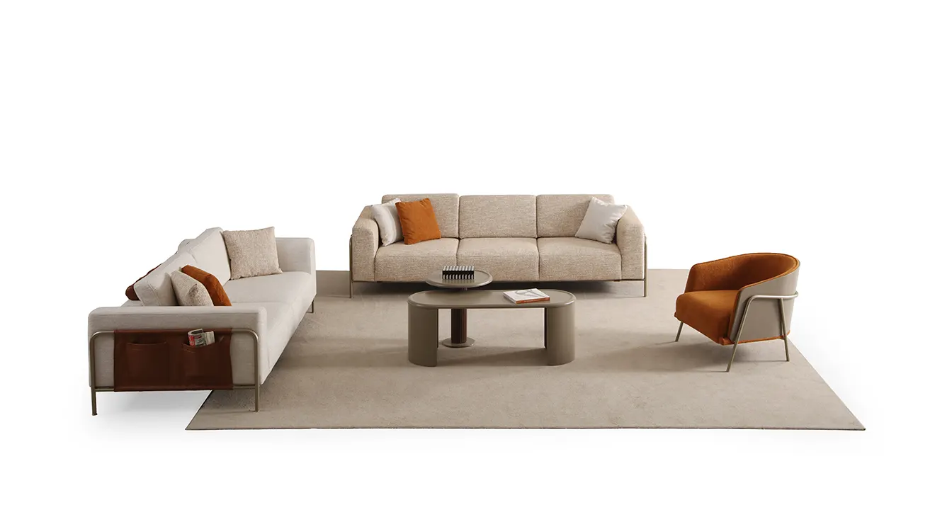 Colt Metal Ayaklı Koltuk Takımı, bej tonlarında dokulu kumaşı ve ince metal ayaklarıyla modern, zarif bir salon atmosferi oluşturur. Geniş oturum alanı ve dengeli sünger yapısı uzun süreli kullanımlarda konfor sunarken, kol yanındaki deri cepli organizer kitap ve dergiler için pratik bir alan sağlar. Sade çizgilere sahip üçlü koltuk, ikili koltuk ve berjer kombinasyonu farklı yerleşimlerde kolayca uyum sağlar. Dayanıklı metal iskelet ve kolay temizlenen döşeme, İnegöl mobilya kalitesini yıllarca korumanıza yardımcı olur.