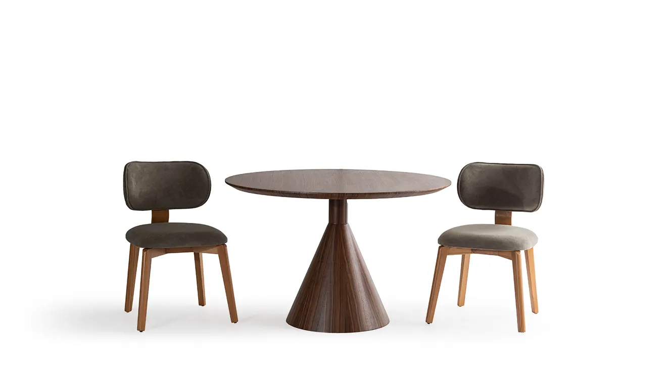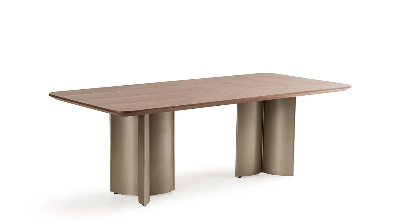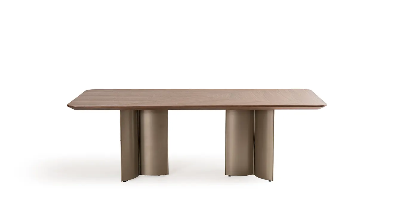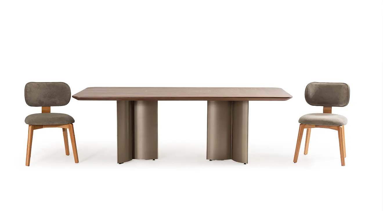 Cozze Ceviz Yemek Masası, ceviz kaplama tablası ve bronz tonlu metal ayaklarıyla modern şıklık sunar; geniş yüzeyi aile sofralarına uygundur.