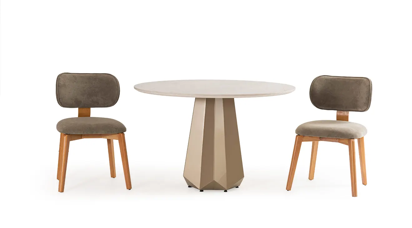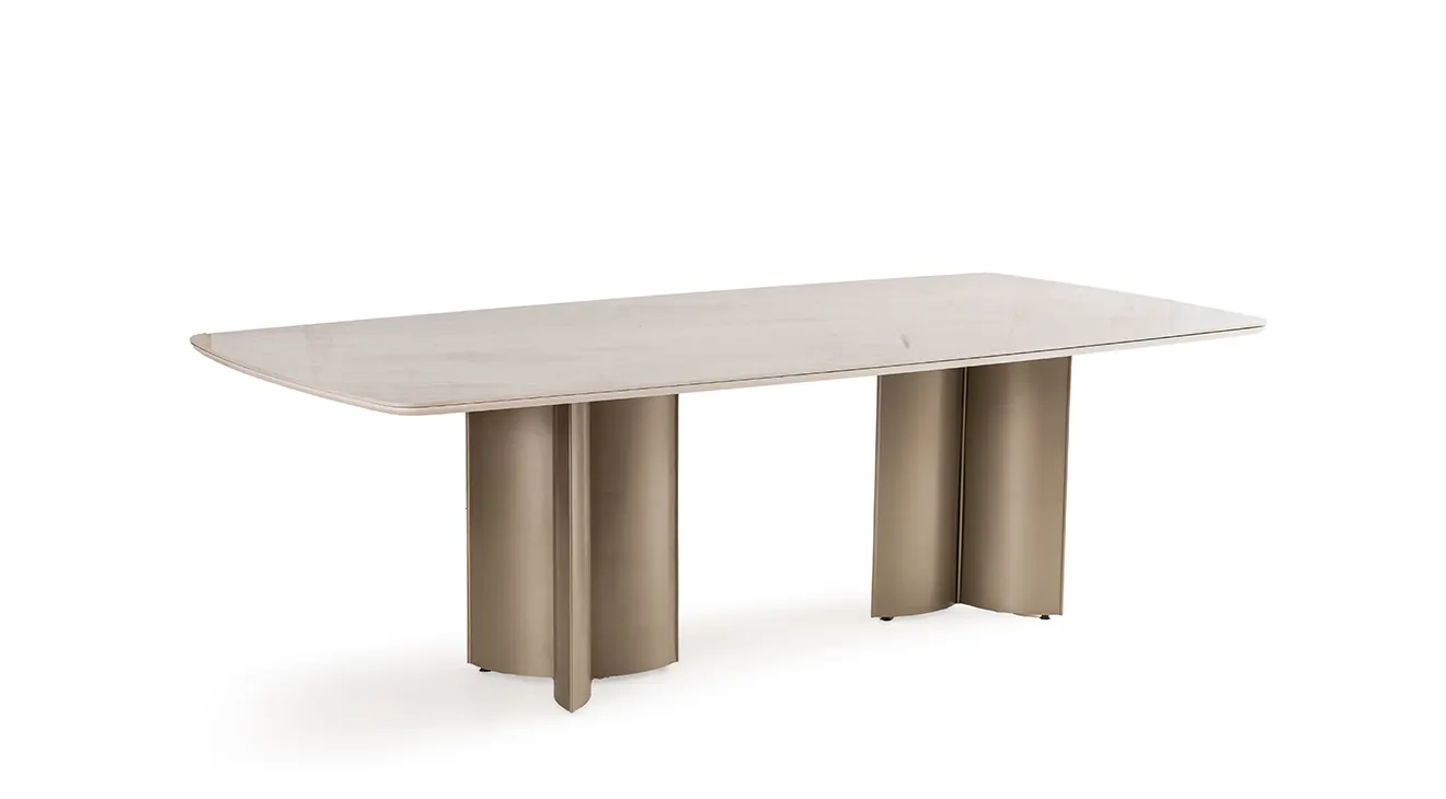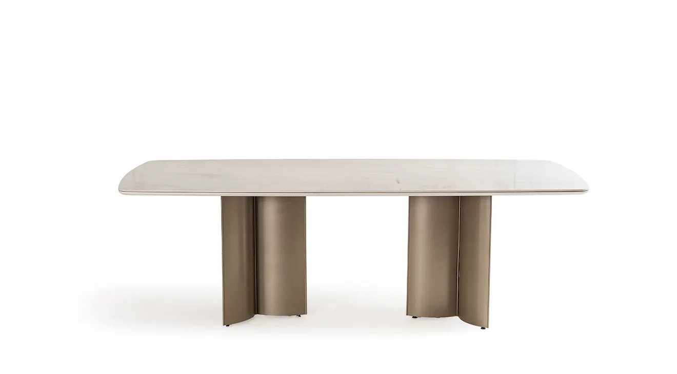 Cozze Seramik Yemek Masası, mermer görünümlü seramik tablası ve bronz metal ayaklarıyla modern duruş sağlar; kolay temizlenir, sağlamdır.