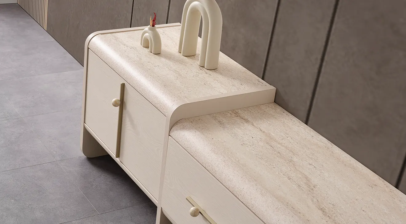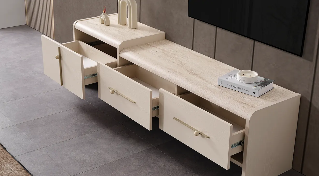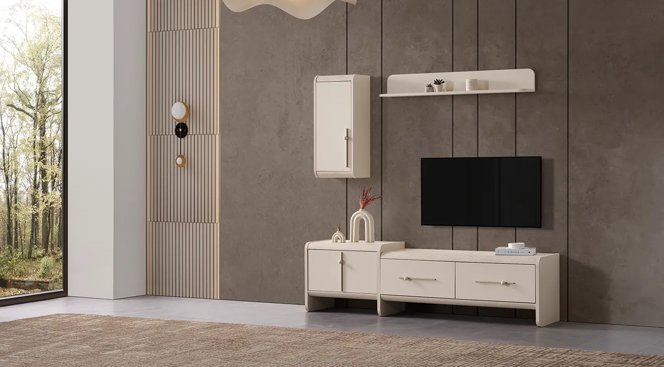 Defne Modern TV Ünitesi; sıcak krem tonları, traverten görünümlü üst tabla ve yumuşatılmış oval köşeleriyle salonunuza sade-şık bir karakter kazandırır. Alçak modülde iki kapaklı bölüm ve geniş çekmeceler; üstte kapaklı duvar dolabı ve raf ekstra depolama sunar. Kablo geçişine uygun iç düzen, kolay temizlenen dayanıklı yüzey, yüksek ayaklar ve akıcı açılır-kapanır donanım günlük kullanımı pratikleştirir. Minimal hatları ve zarif kulplarıyla Defne, İnegöl işçiliğini estetik ve işle bir araya getirir.