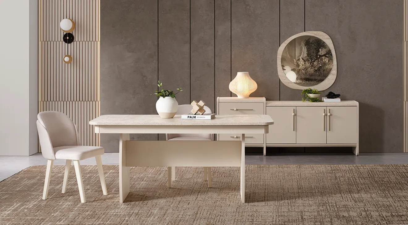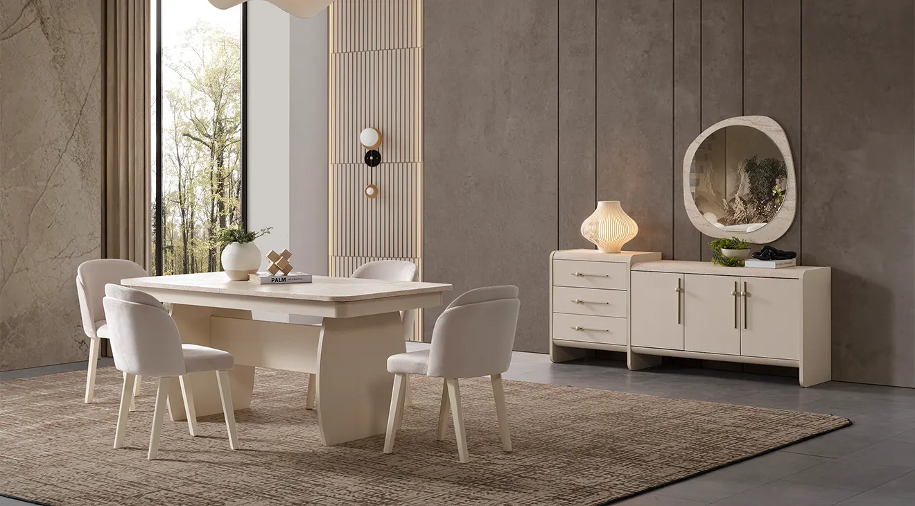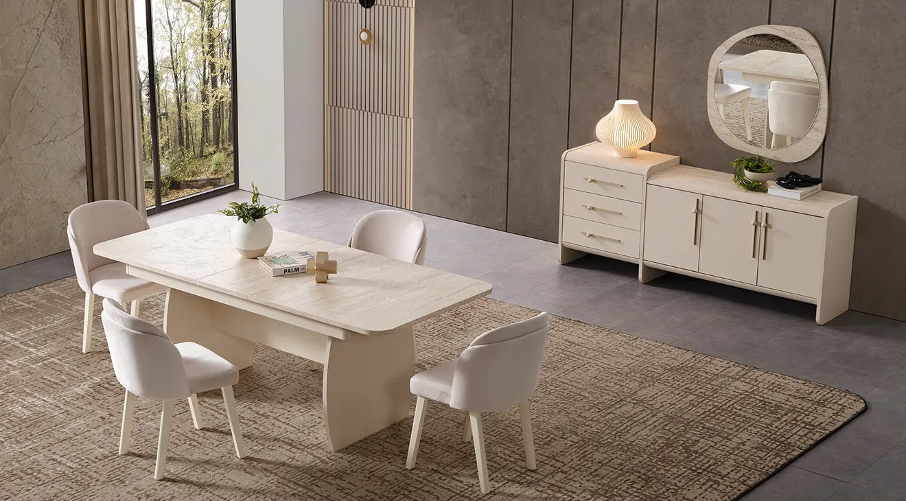 Defne, yumuşak bej tonları, yuvarlatılmış hatları ve traverten dokulu üst yüzeyiyle sakin, modern bir atmosfer kurar. Açılır mekanizmaya sahip masa; kalabalık sofralarda rahat alan sunarken, konforlu sandalyeler uzun oturumlarda bile destek sağlar. Konsol, üç çekmeli modül ve iki kapaklı geniş dolabıyla düzeni kolaylaştırır; zarif metal kulplar ve dayanıklı yüzeyler günlük kullanımı pratikleştirir. Doğal formlu ayna ve bütüncül tasarım diliyle Defne, İnegöl işçiliğini estetik ve işlevle bir araya getirir.