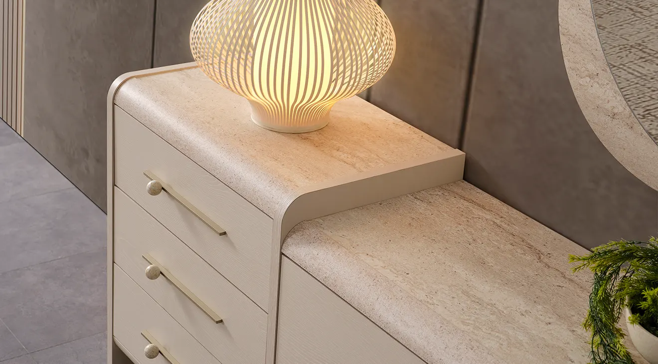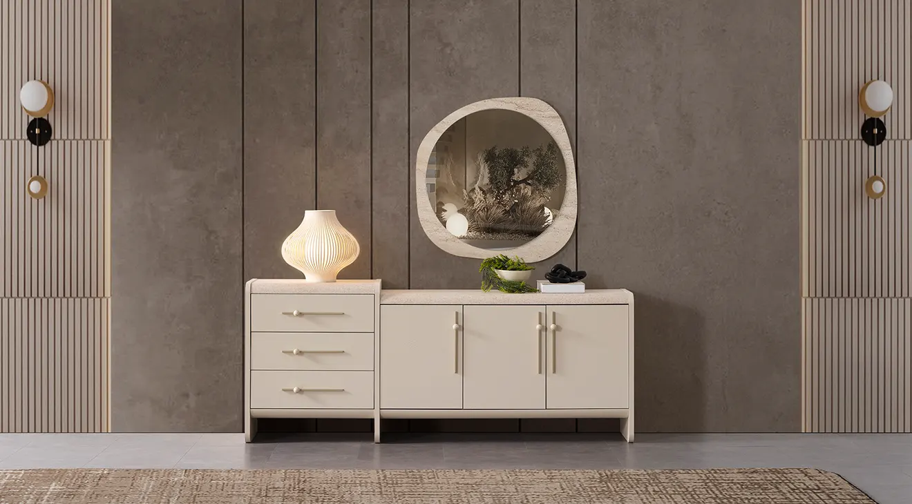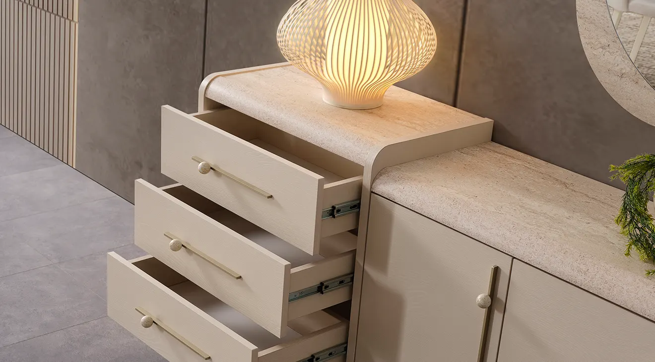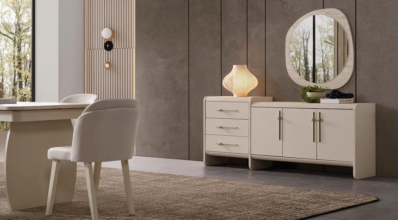 Defne, yumuşak bej tonları, yuvarlatılmış hatları ve traverten dokulu üst yüzeyiyle sakin, modern bir atmosfer kurar. Açılır mekanizmaya sahip masa; kalabalık sofralarda rahat alan sunarken, konforlu sandalyeler uzun oturumlarda bile destek sağlar. Konsol, üç çekmeli modül ve iki kapaklı geniş dolabıyla düzeni kolaylaştırır; zarif metal kulplar ve dayanıklı yüzeyler günlük kullanımı pratikleştirir. Doğal formlu ayna ve bütüncül tasarım diliyle Defne, İnegöl işçiliğini estetik ve işlevle bir araya getirir.