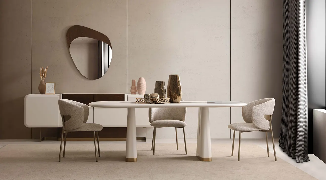 Delta Modern Yemek Odası Takımı, şıklığı ve modern tasarımı bir araya getiriyor. Yüksek kaliteli malzemelerle üretilmiş, geniş masa ve zarif sandalye detaylarıyla dikkat çekiyor. Krem tonları, her mekana uyum sağlayacak sıcak ve doğal bir atmosfer yaratır. İnegöl mobilya kalitesini evinize taşıyın.