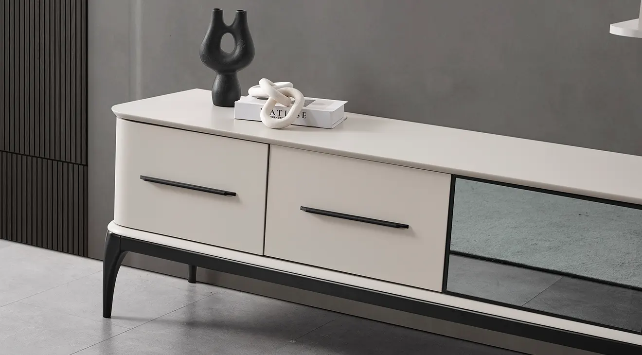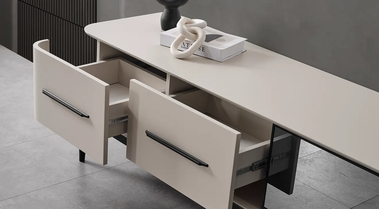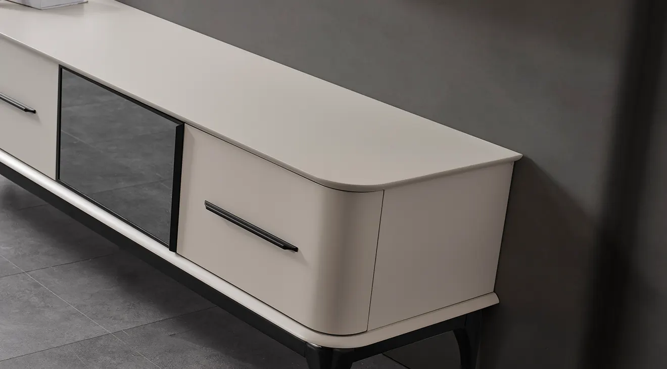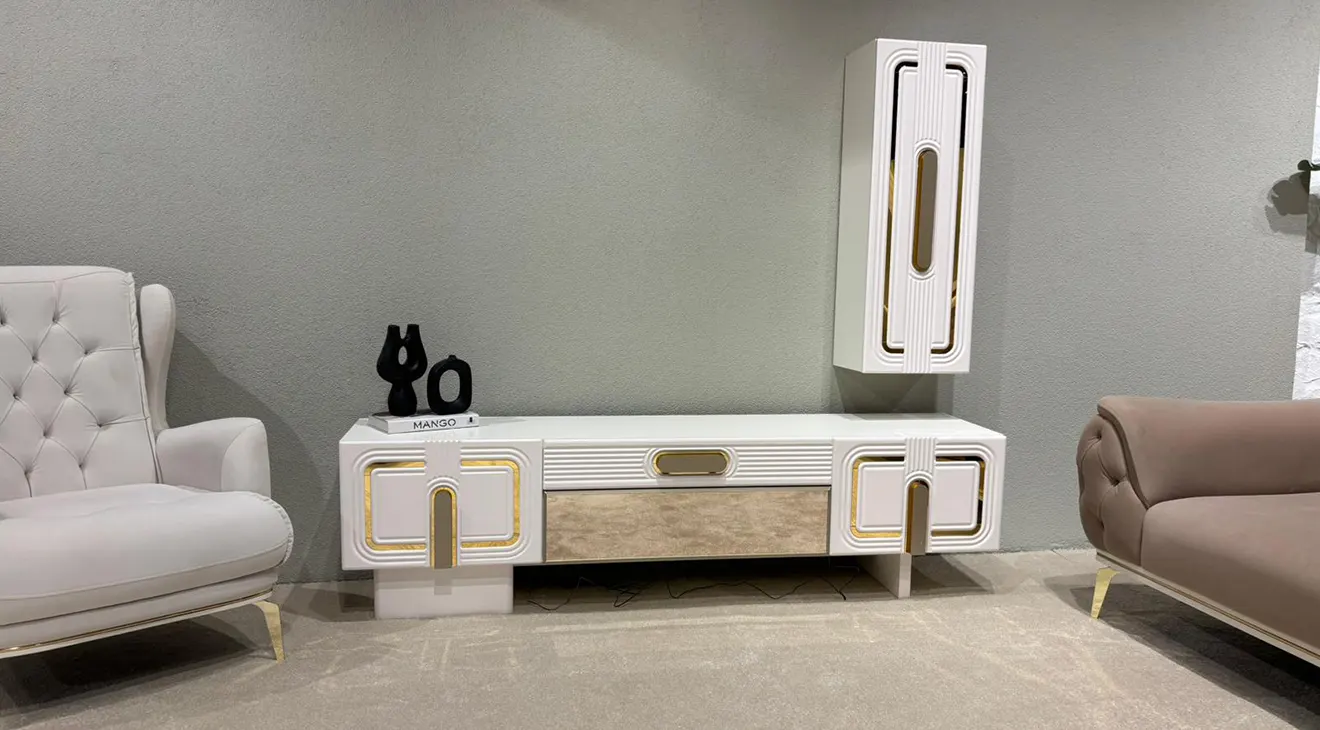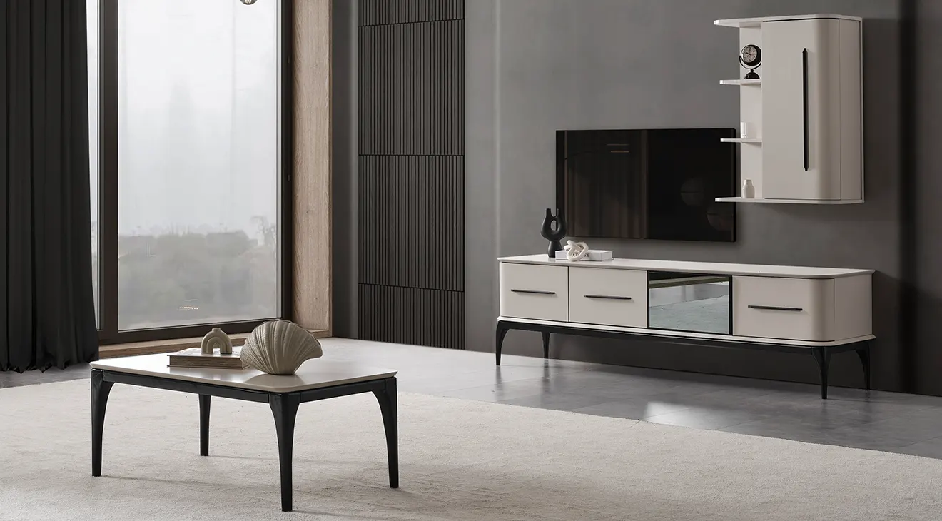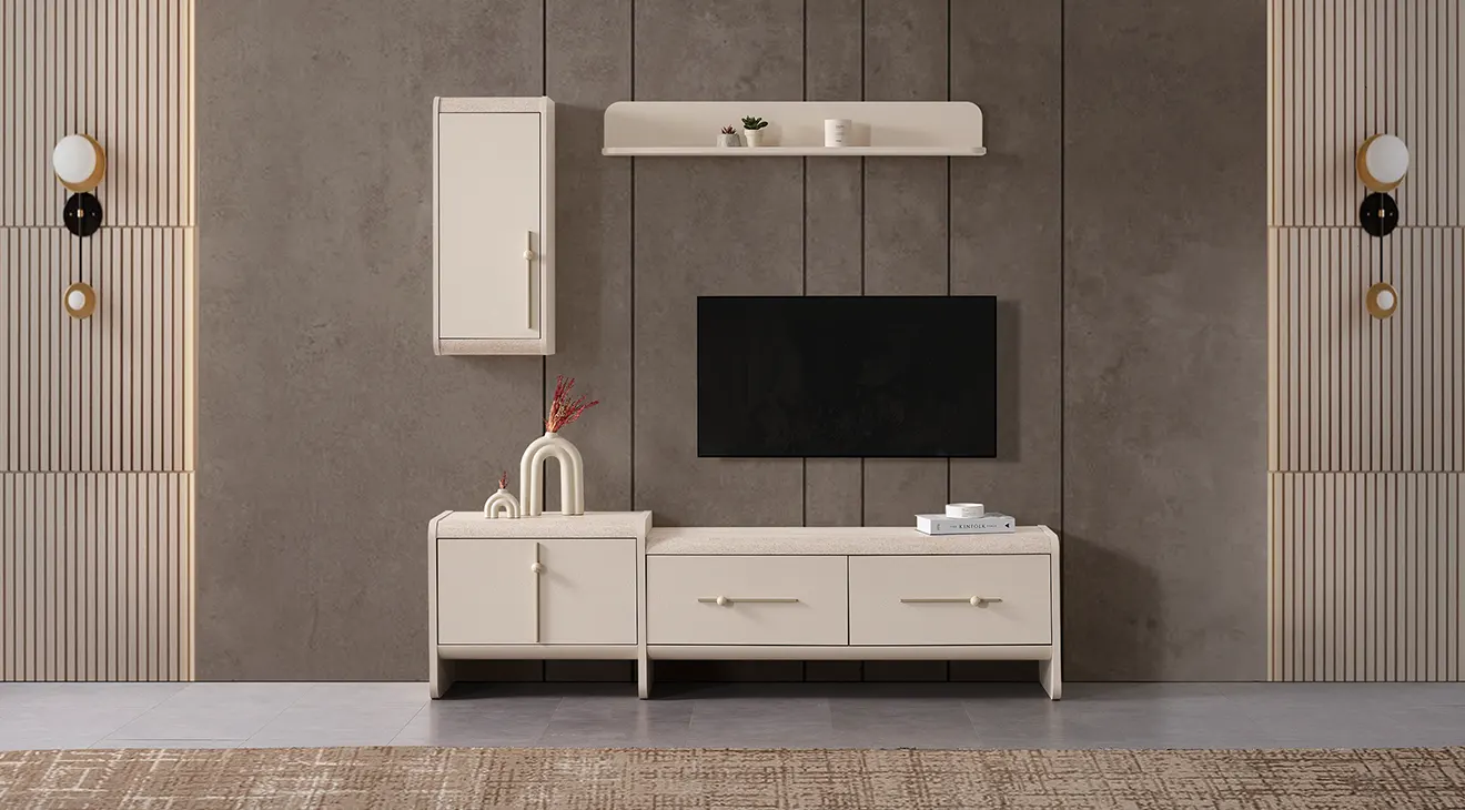 Minimal çizgiler, ahşap ayak ve geniş depolama. TV’lerle uyumlu Destan TV ünitesiyle salonunuza modern bir görünüm katın.