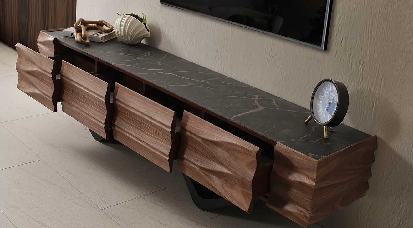 Dolunay Ceviz Metal Ayaklı TV Ünitesi; MDF gövde, aytaşı üst yüzey ve modern metal ayaklarıyla şık görünüm, geniş depolama sunar.