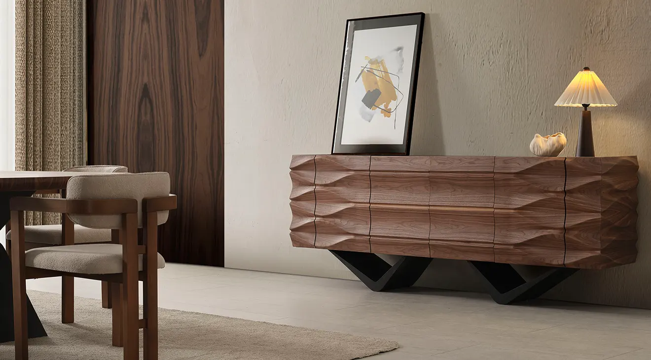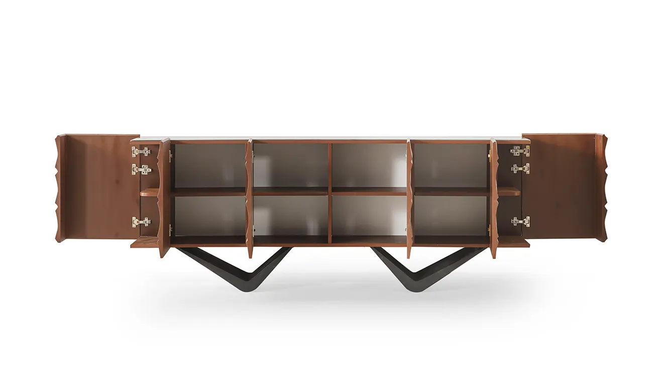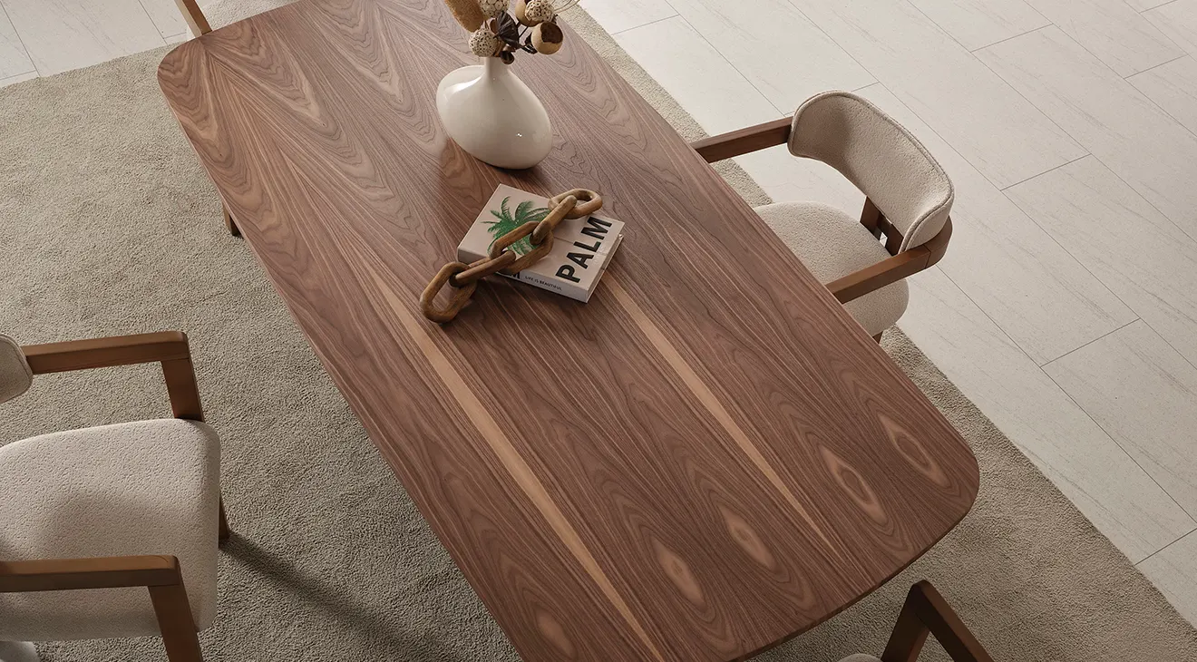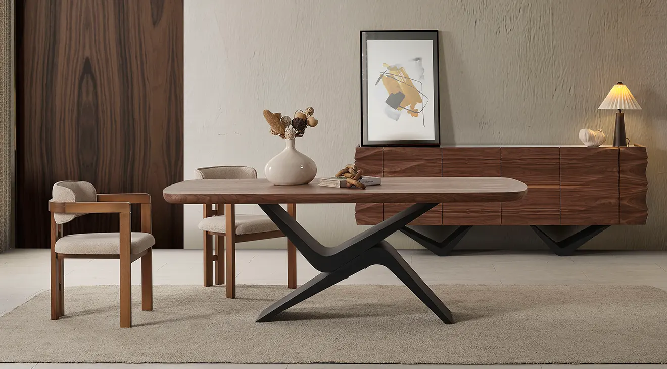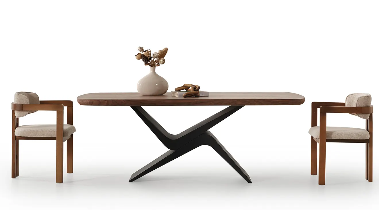 Dolunay Ceviz Yemek Odası Takımı siyah metal ayakların modern duruşunu ceviz sıcaklığıyla birleştirir. MDF gövde ve sabit masa yapısıyla.