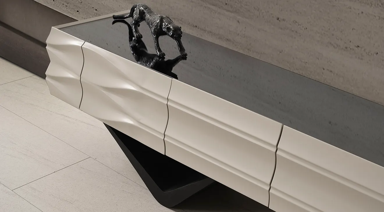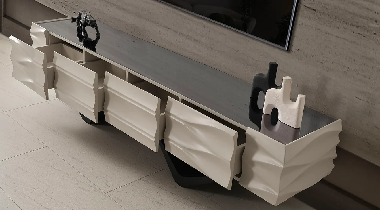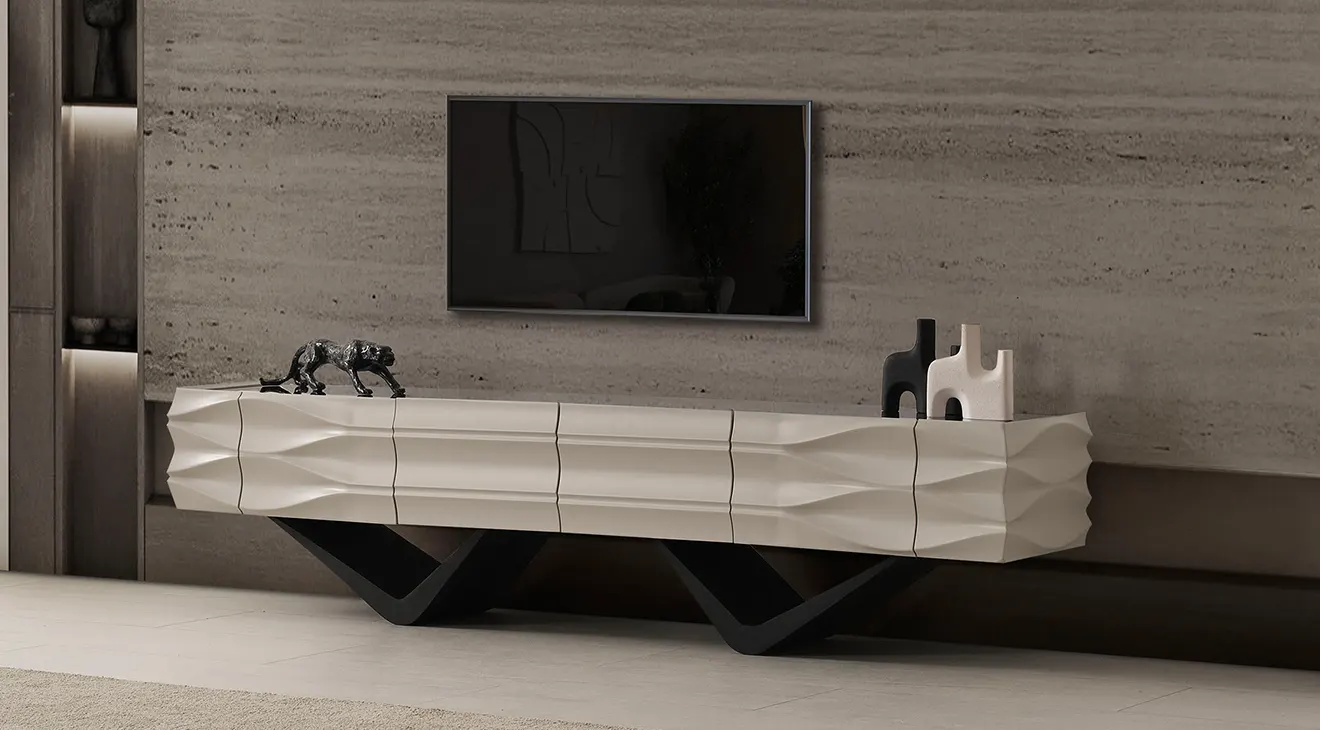 olunay TV Ünitesi, aytaşı renkli MDF gövdesi ve heykelsi kapak dokusuyla dikkat çeker; metal ayaklı formu geniş depolama sağlar.