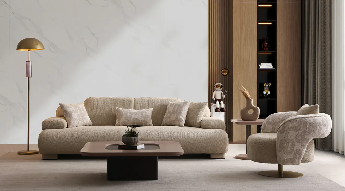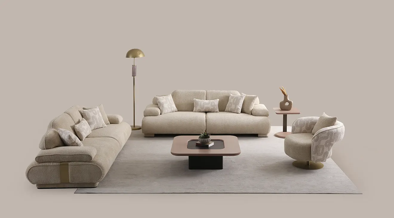 Edra Koltuk Takımı, krem tonlarındaki bouclé dokusu ve yumuşak, yuvarlak hatlarıyla salonda zarif ve davetkâr bir atmosfer oluşturur. Geniş oturum alanı, destekli kol ve sırt minderleri uzun süreli kullanımlarda ekstra konfor sunarken; sağlam ahşap ayaklar ve kaliteli iskelet yapısı İnegöl mobilya dayanıklılığını yıllarca korur. Döner berjer detayı ise hem kullanışlı hem de modern bir dokunuş katar.