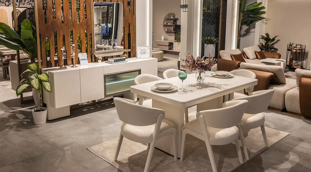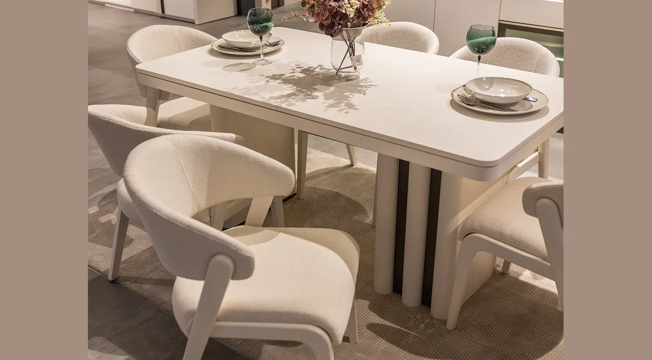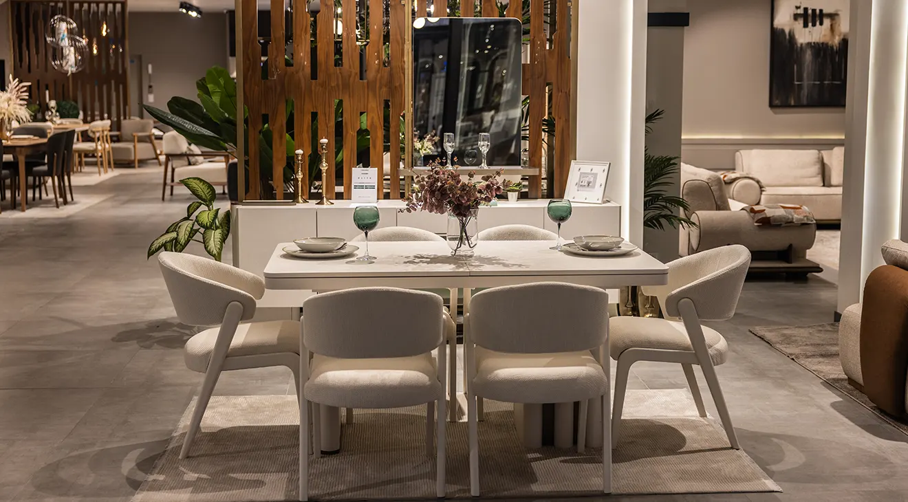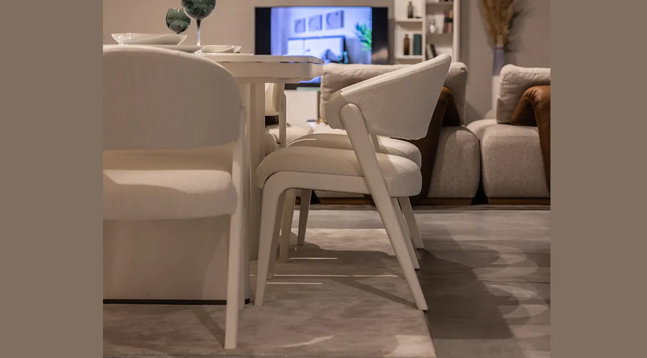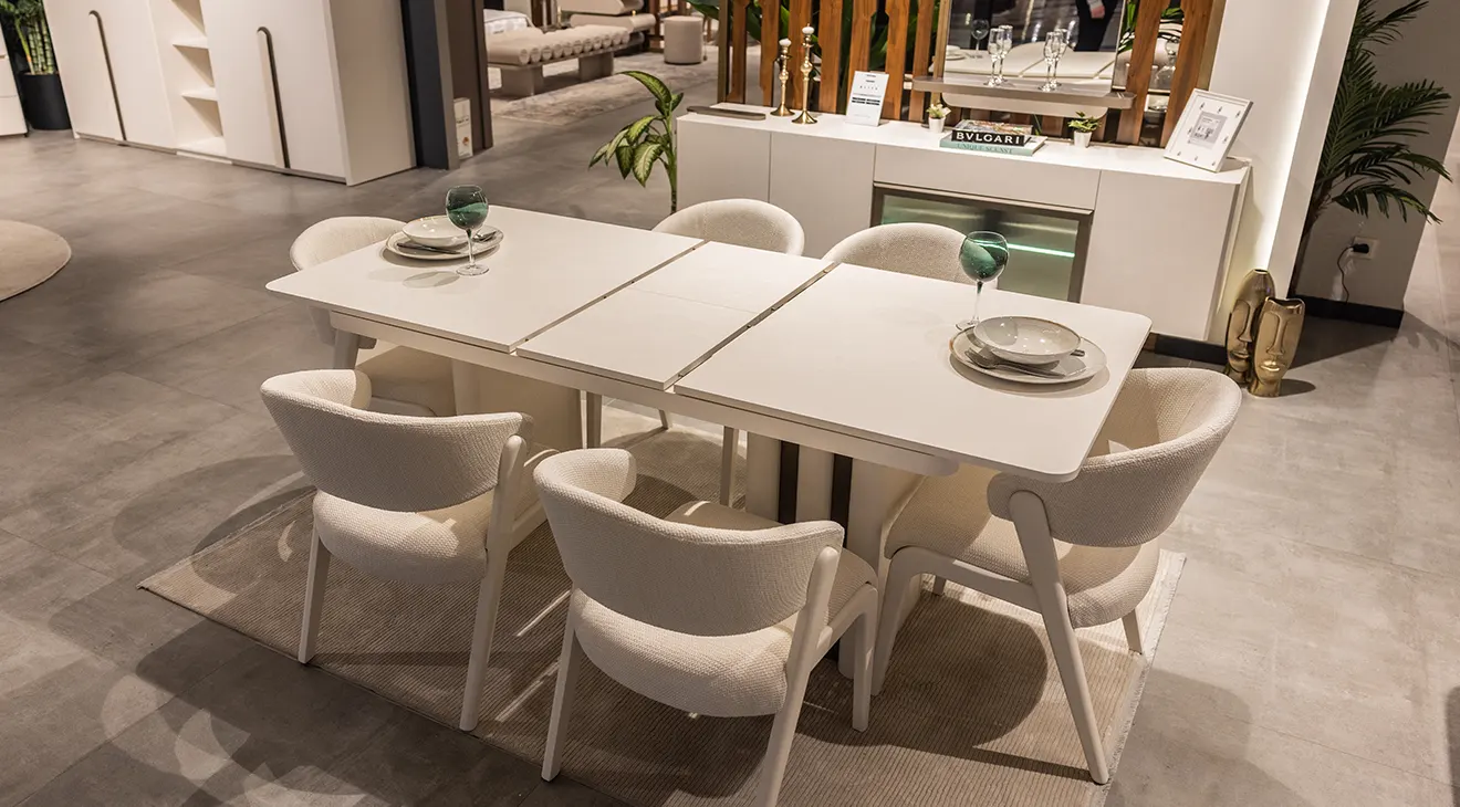 Elite Modern Yemek Odası Takımı, mat beyaz lake yüzeyi ve cam vitrin bölmesiyle odanıza ferahlık getiriyor. Zarif kavisli hatlara sahip yemek masası, ortasında konumlanan sağlam sütun ayaklarıyla destekleniyor. Minderli, yumuşak dokulu sandalyeler uzun sohbetlere davet ederken; entegre LED aydınlatmalı konsol ünitesi, soft‑close kapakları ve şık aynasıyla şıklığı tamamlıyor.