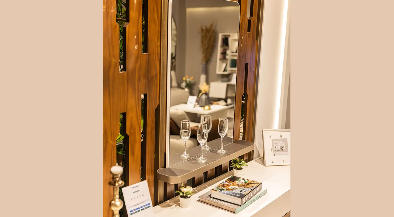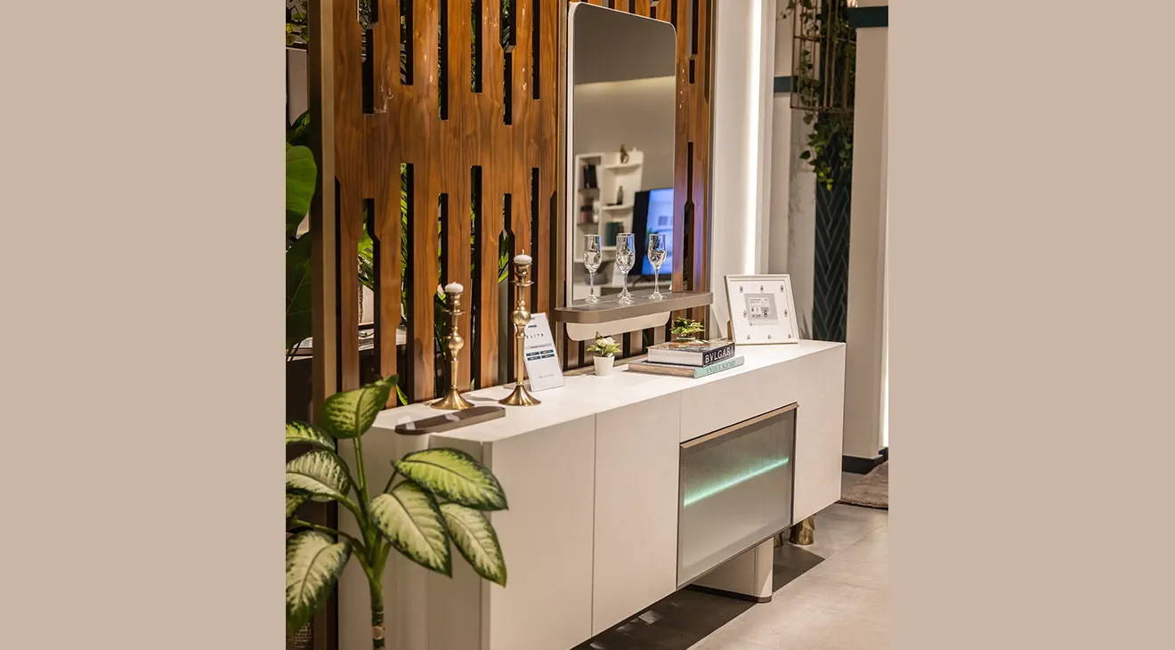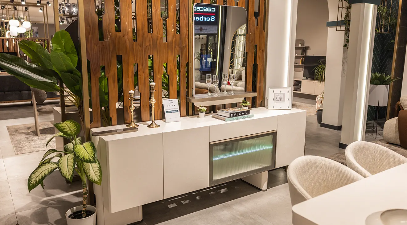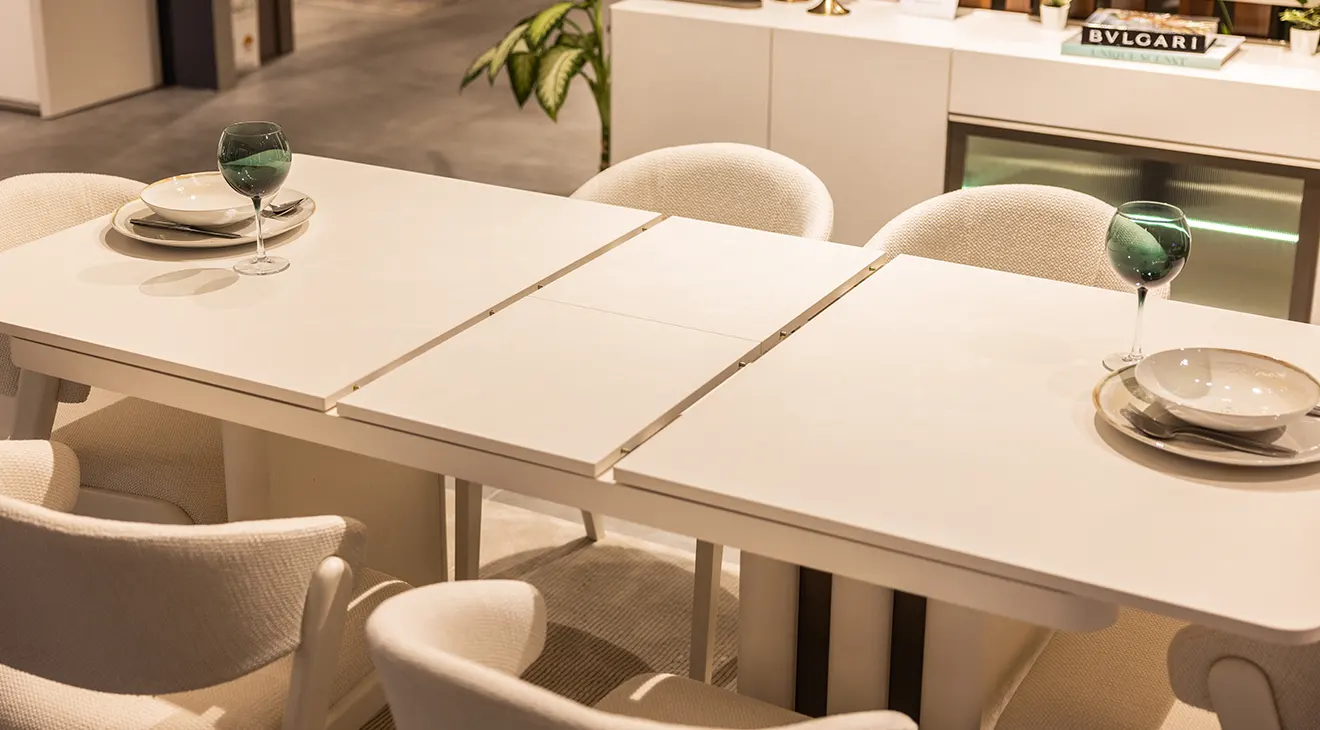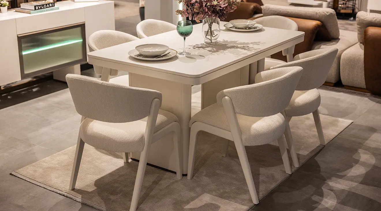 Elite Modern Yemek Odası Takımı, mat beyaz lake yüzeyi ve cam vitrin bölmesiyle odanıza ferahlık getiriyor. Zarif kavisli hatlara sahip yemek masası, ortasında konumlanan sağlam sütun ayaklarıyla destekleniyor. Minderli, yumuşak dokulu sandalyeler uzun sohbetlere davet ederken; entegre LED aydınlatmalı konsol ünitesi, soft‑close kapakları ve şık aynasıyla şıklığı tamamlıyor.