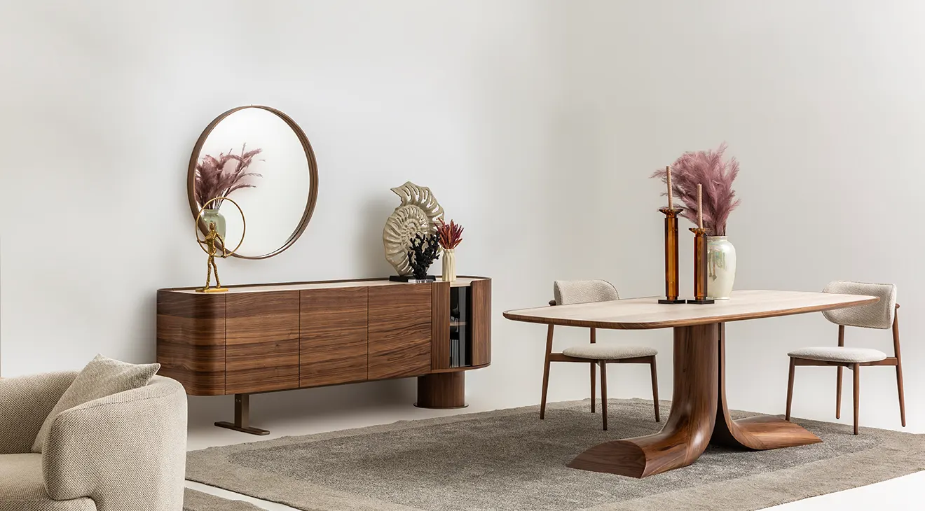 Emir Modern Yemek Odası Takımı, modern tasarımı, kahverengi rengi ve özel tasarım konsolu ile İnegöl Mobilya markalı özel üretim ürünlerinden.