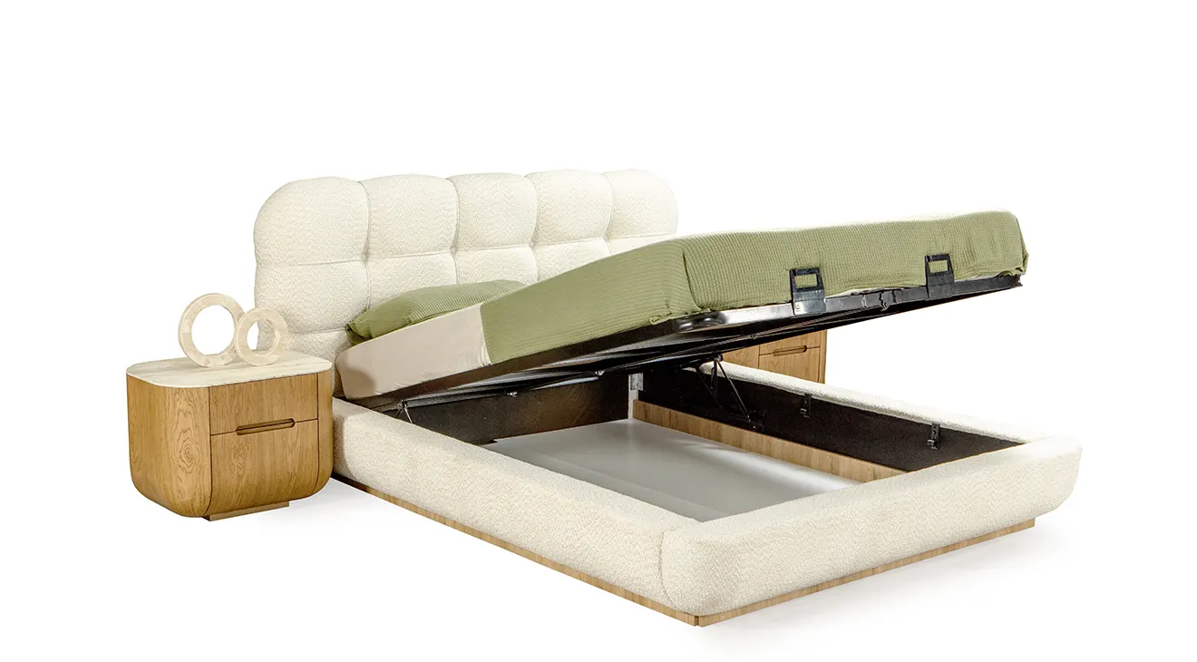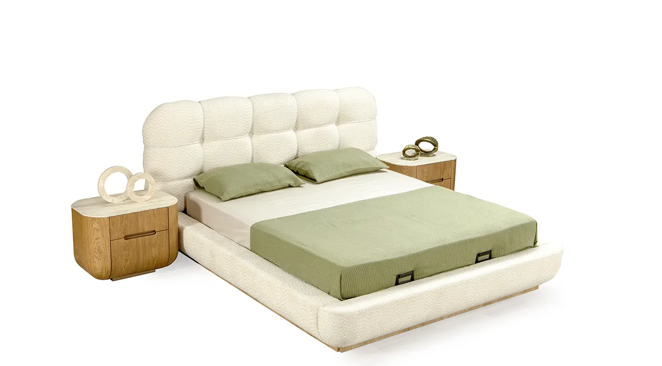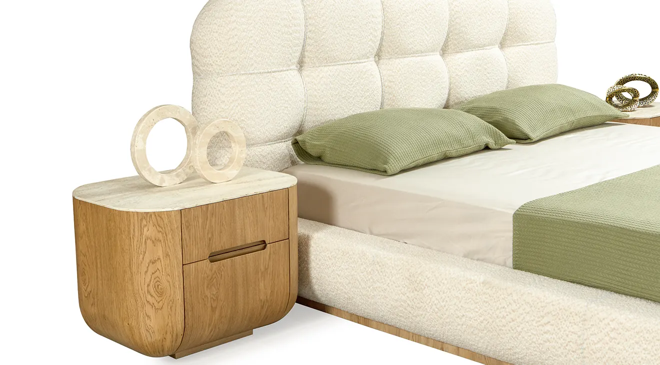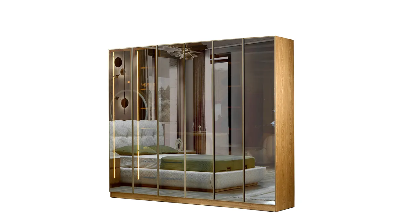 Era 6 Kapaklı Yatak Odası Takımı; altın tonlu cam kapaklı geniş gardırop, yumuşak dokulu başlıklı şık karyola ve zarif traverten detaylı şifonyeriyle fark yaratır. Sade ama lüks tasarımıyla yatak odanıza ferahlık ve konfor getirir.