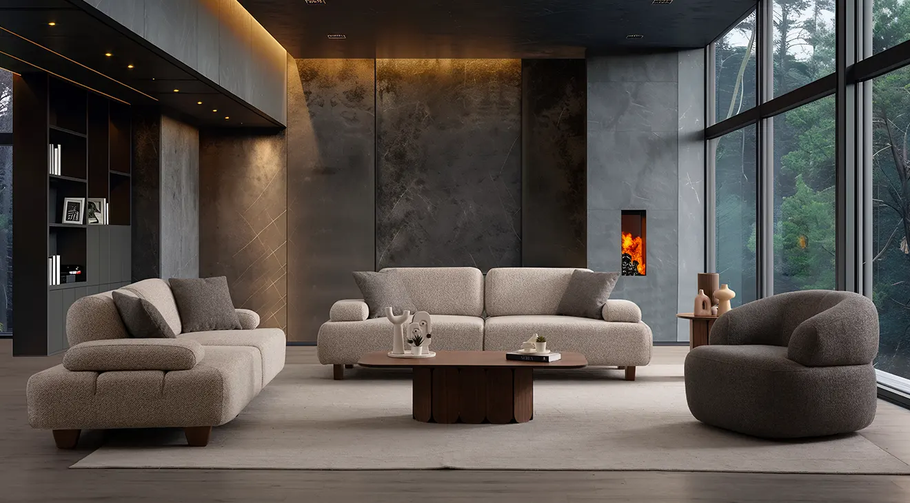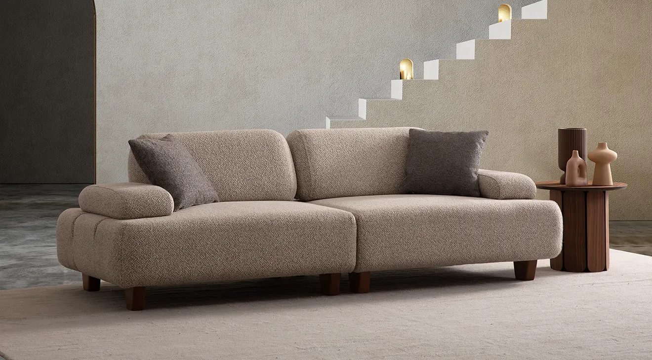EWORA yataklı koltuk takımı; modern çizgiler, bouclé kumaş ve geniş oturumla öne çıkar. Kolay açılan yatak fonksiyonu ve sağlam iskeletle salon mobilyasında şıklık ve konfor sunar.