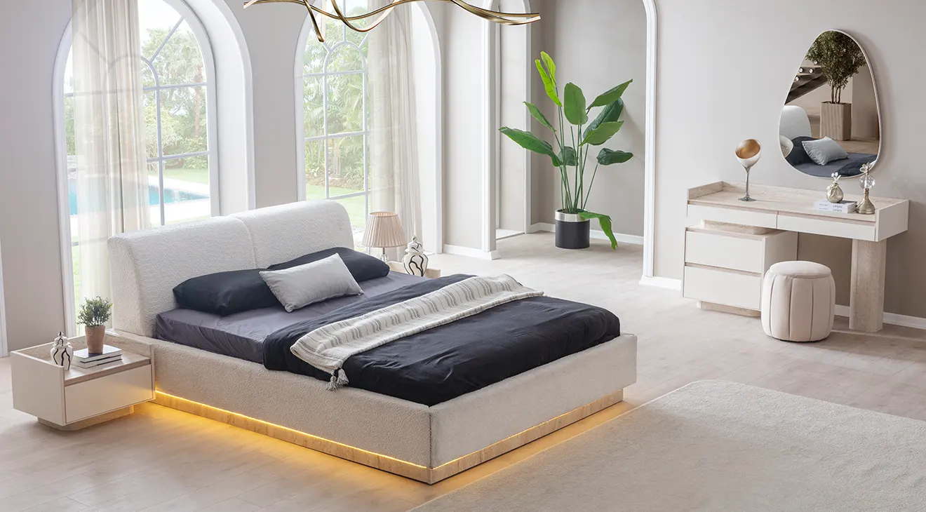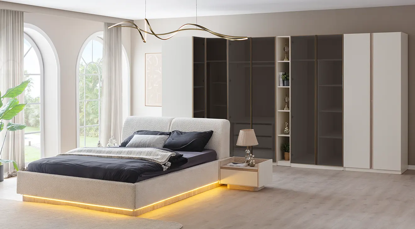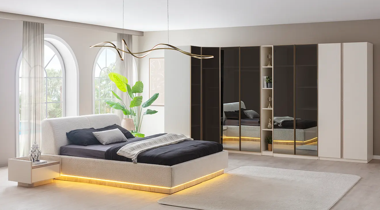 Flora Köşe Dolaplı Yatak Odası Takımı, modern tasarımı ve fonksiyonel yapısıyla yaşam alanınıza estetik ve konfor katıyor. Köşe dolaplı geniş depolama alanı, eşyalarınızı düzenli tutarken odanızı daha ferah bir hale getirir. Yüksek kaliteli malzemelerle üretilmiş olup, zarif detayları ve LED aydınlatmalı bazası ile şıklığı ön plana çıkarıyor.