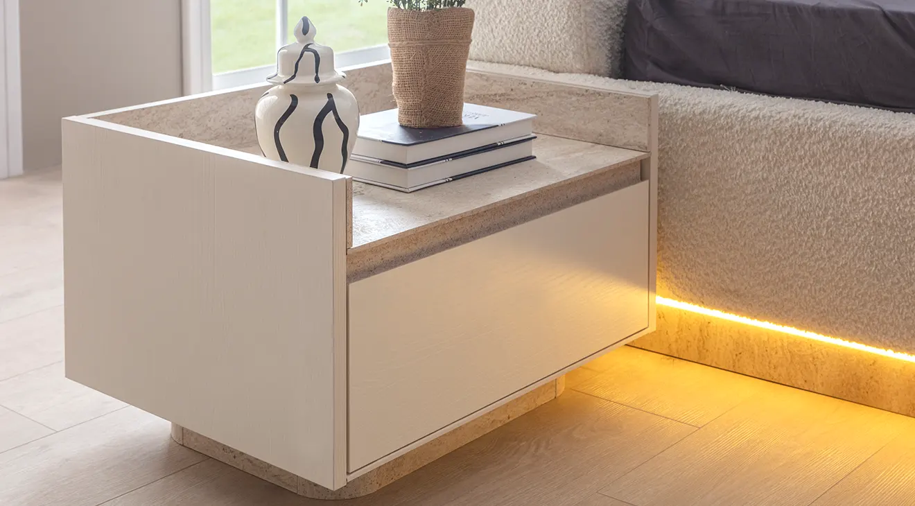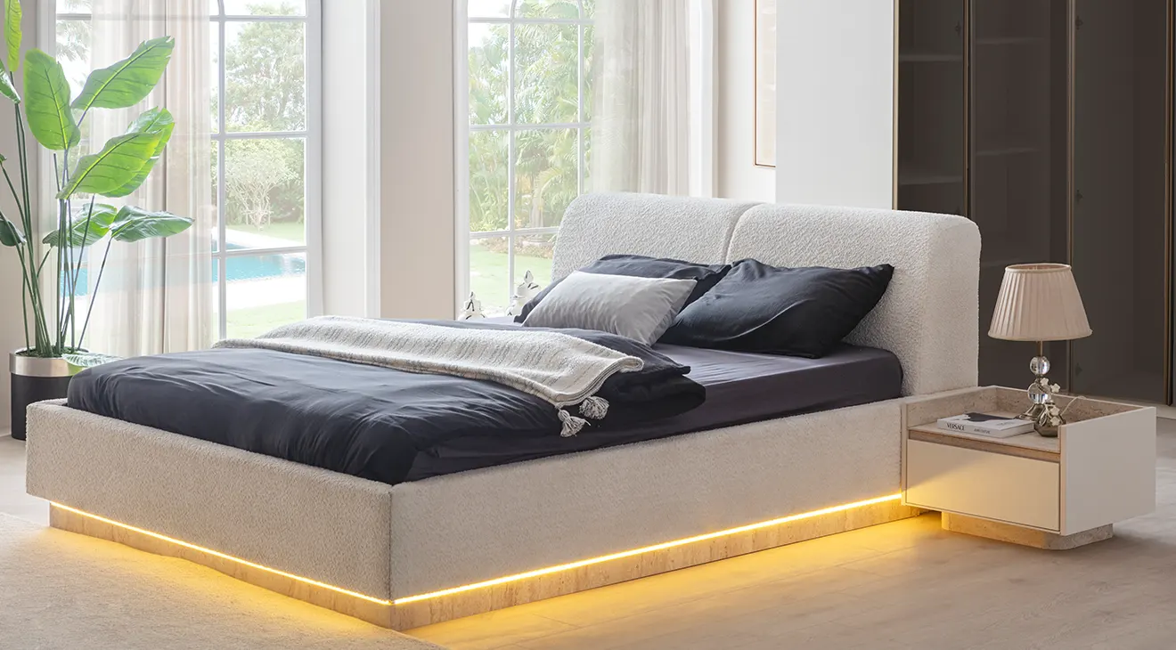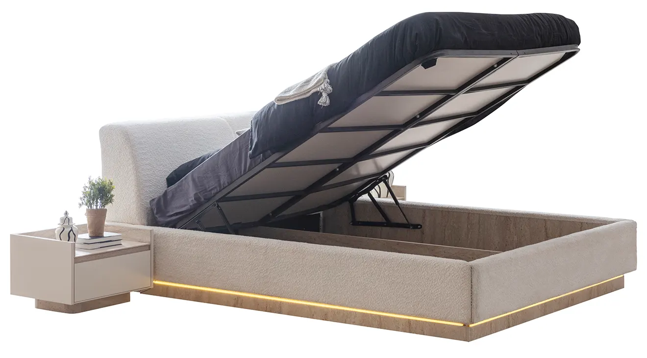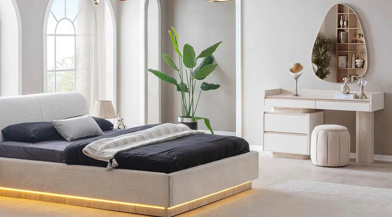 Flora Köşe Dolaplı Yatak Odası Takımı, modern tasarımı ve fonksiyonel yapısıyla yaşam alanınıza estetik ve konfor katıyor. Köşe dolaplı geniş depolama alanı, eşyalarınızı düzenli tutarken odanızı daha ferah bir hale getirir. Yüksek kaliteli malzemelerle üretilmiş olup, zarif detayları ve LED aydınlatmalı bazası ile şıklığı ön plana çıkarıyor.