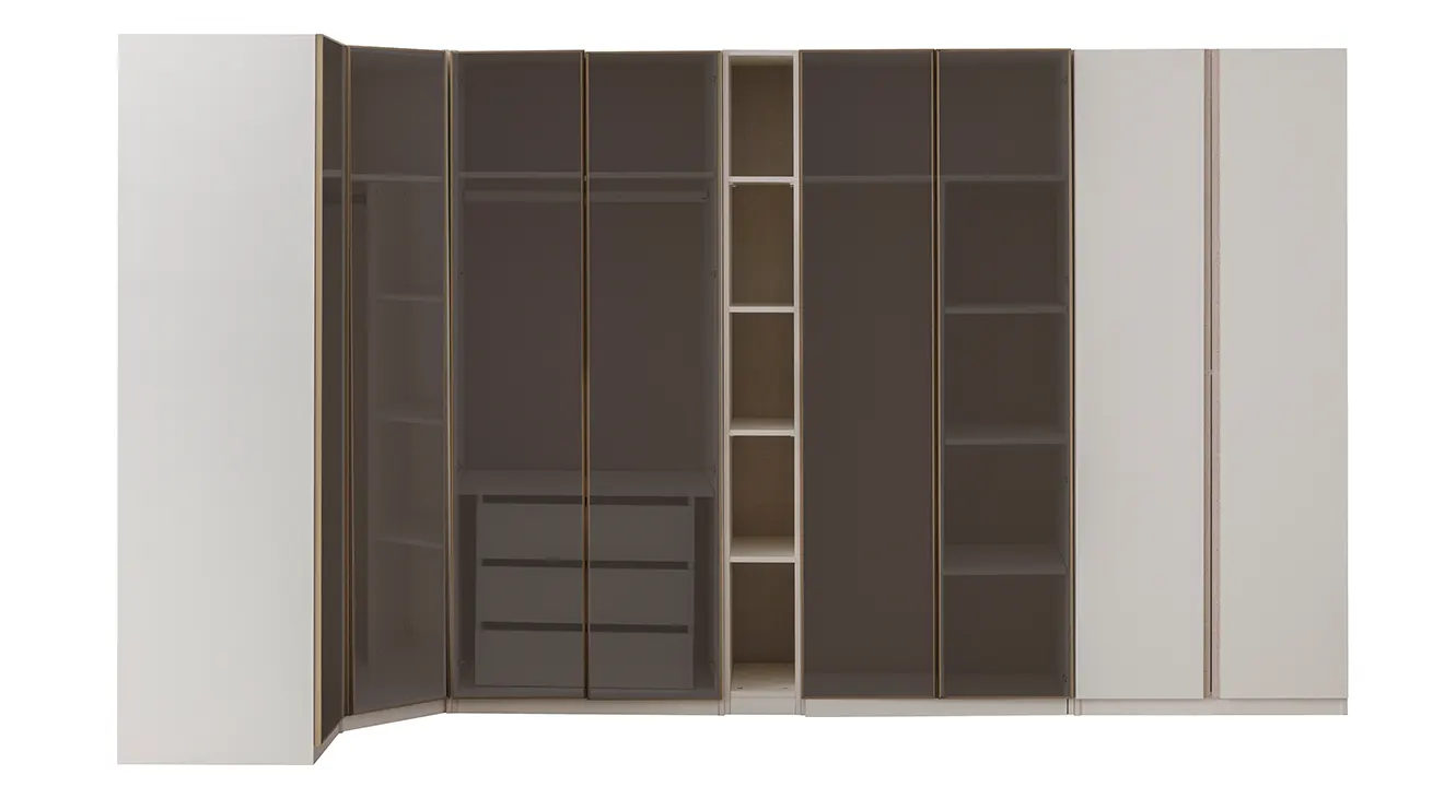 Köşe Dolap: Tekli Raflı Modül + Köşe Modül + İkili Kapaklı Çekmeceli Modül + 25 cm Raflı Modül + İki Kapaklı Raflı Modül + İki Kapaklı Askılıklı Modül