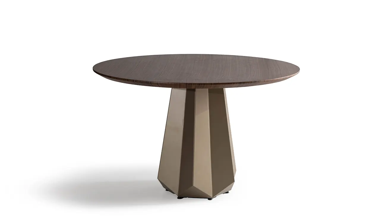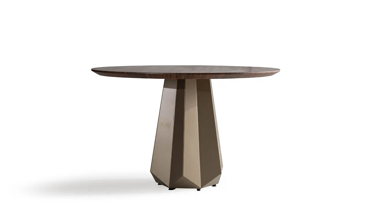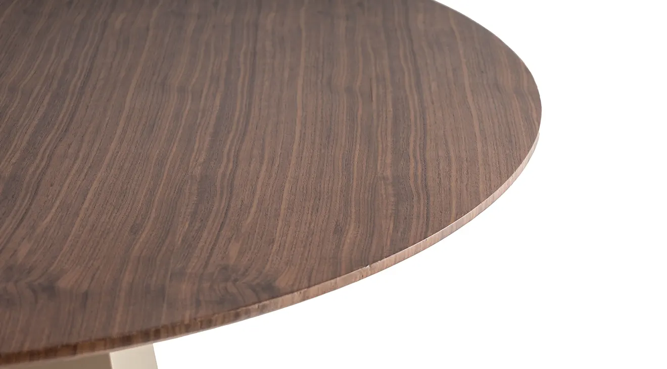 Fontano ceviz yuvarlak masa; ceviz desenli üst ve heykelsi metal ayakla modern bir odak noktası. Yuvarlak form sohbeti yakınlaştırır.