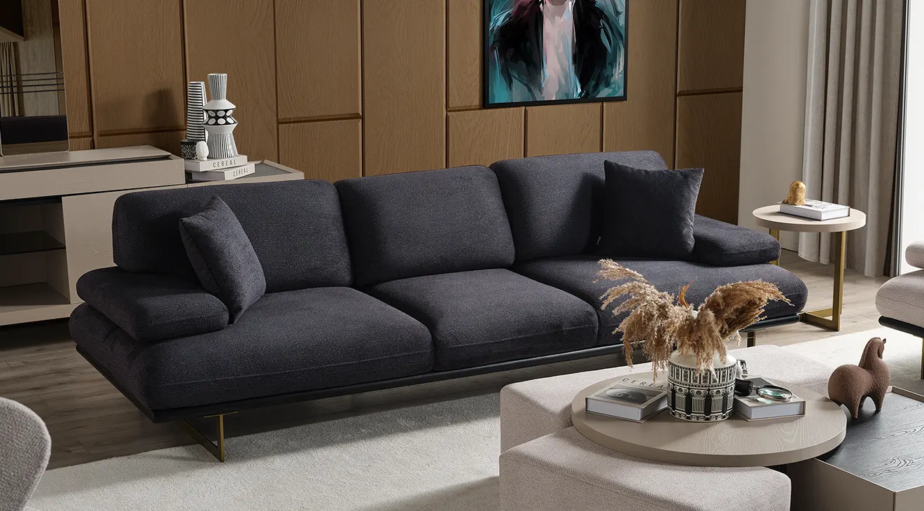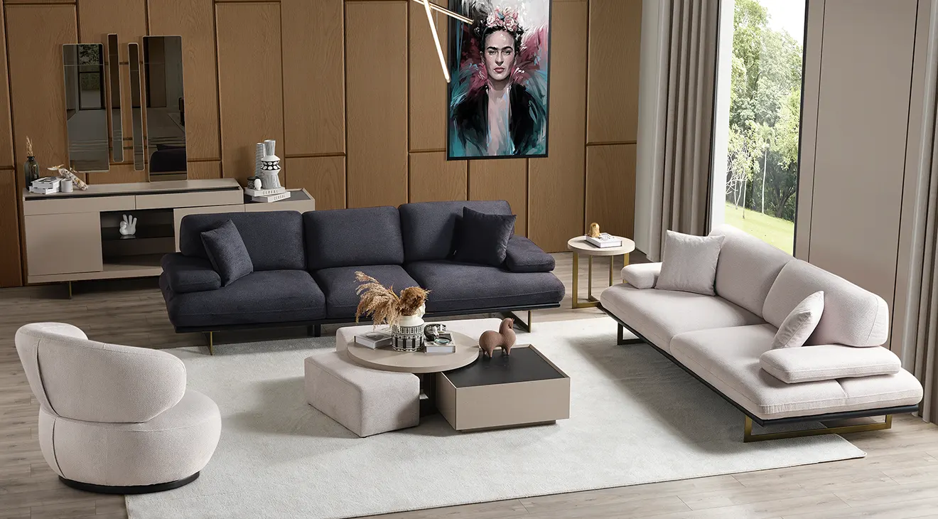 Frida Mekanizmalı Koltuk Takımı, zarif metal ayakları ve ince profilli kolçaklarıyla salonunuza şık bir dokunuş sunuyor. Kumaş döşemede saklı mekanizma sayesinde oturma açısını kolayca ayarlayarak konforu kişiselleştirebilirsiniz. Koyu antrasit ve soft bej seçenekleriyle her dekorasyona uyum sağlayan Frida, geniş oturum minderi ve destekleyici sırt yapısıyla uzun sohbetlere ve film gecelerine davet ediyor.