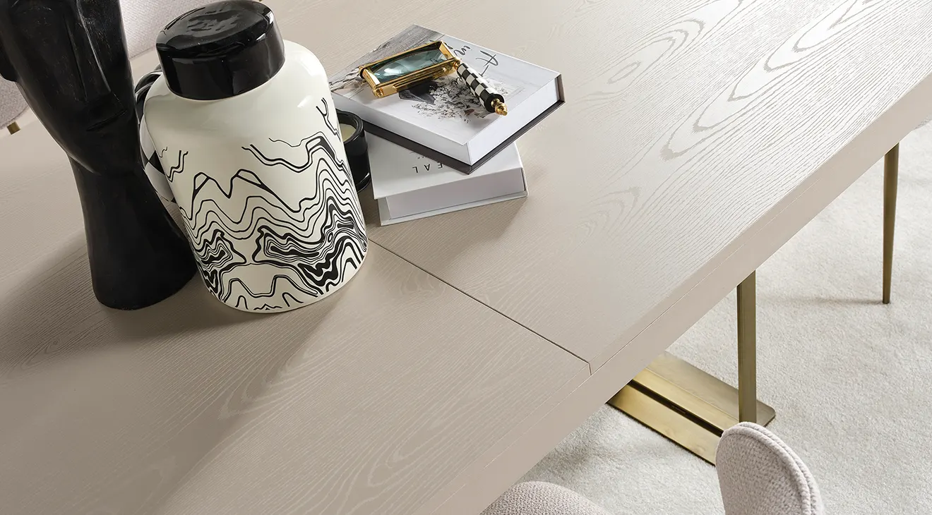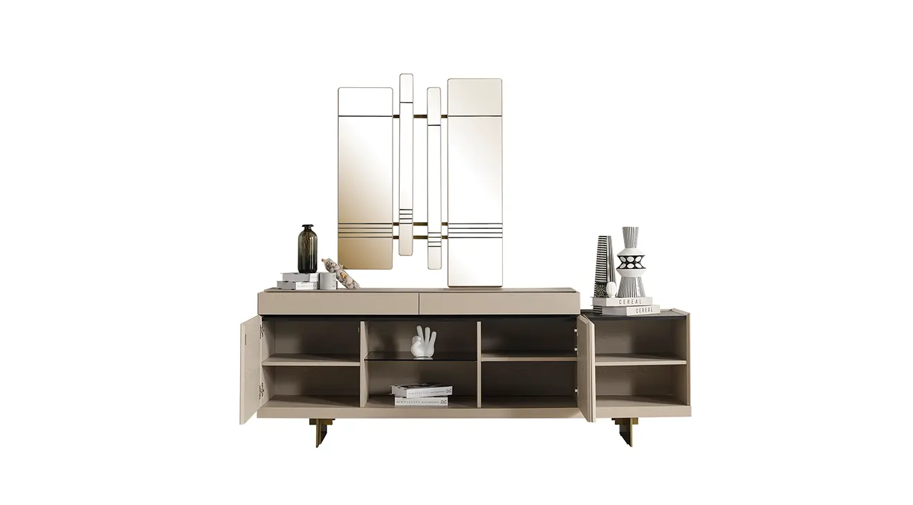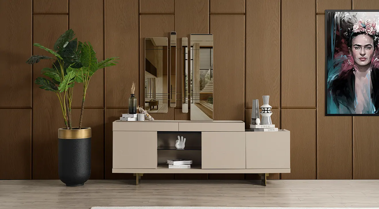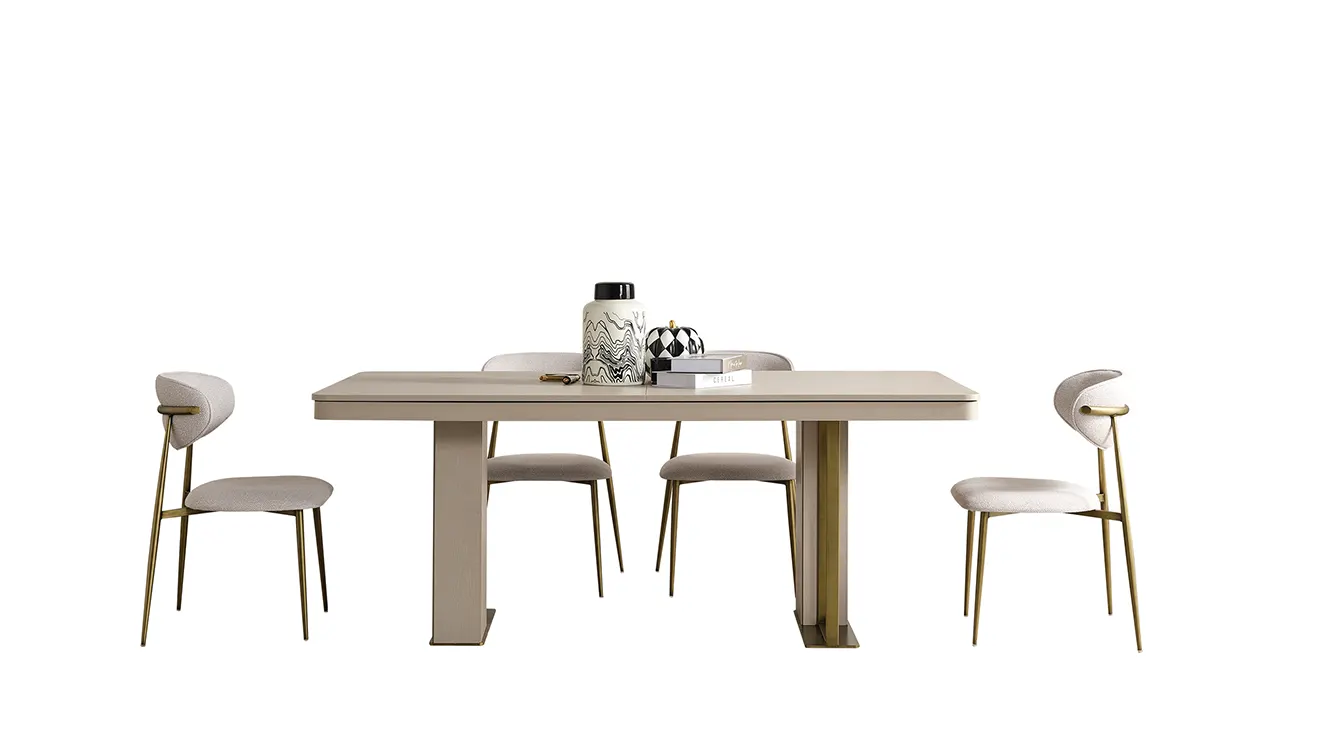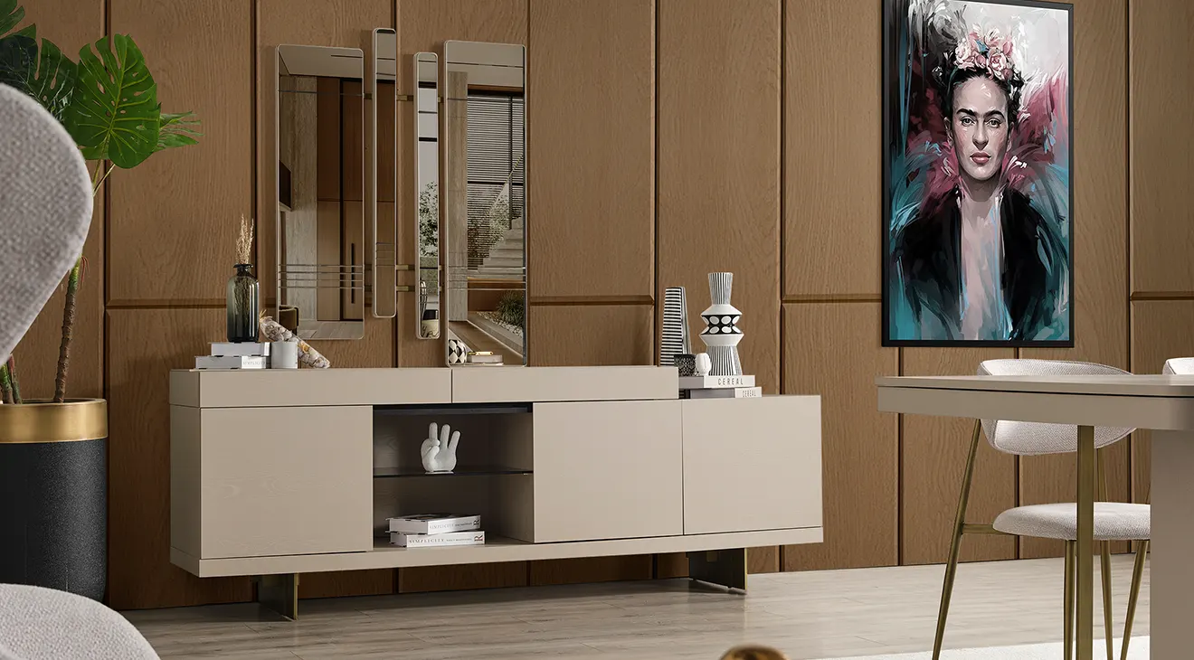 Frida Metal Ayaklı Yemek Odası Takımı, soft bej tonları ve zarif pirinç görünümlü metal ayaklarıyla modern yemek alanları için ideal. Uzayan masa özelliğiyle misafir ağırlamayı kolaylaştırırken, şık konsol ünitesi depolama ve sergileme imkânı sunar. Narin tasarımıyla mekâna ferahlık katıp, her sofrayı özel kılar.